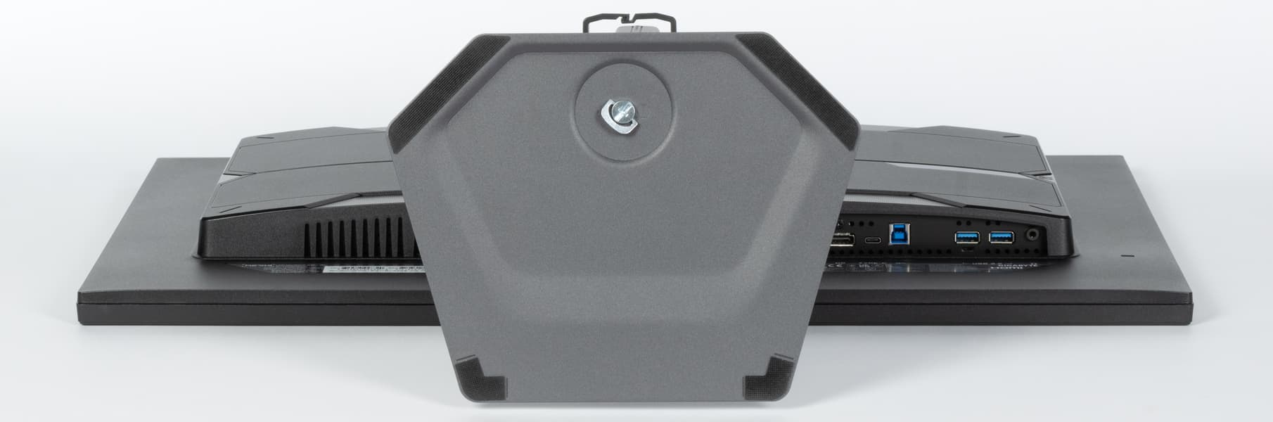 Разъем питания и интерфейсные разъемы расположены на нижнем торце выступа сзади и ориентированы вниз. Подключать кабели к монитору удобнее при перевороте блока экрана в портретную ориентацию. Кабели, идущие от разъемов монитора, можно прижать фиксатором к стойке подставки: так сзади монитор выглядит аккуратнее.