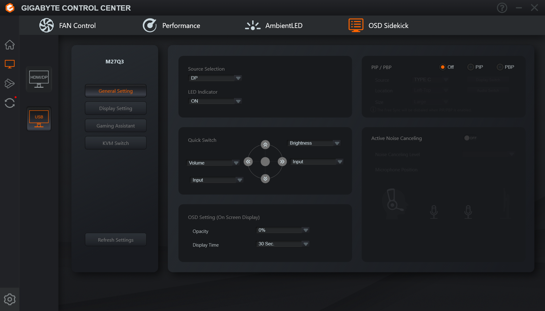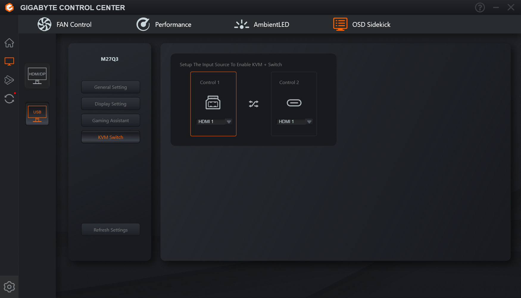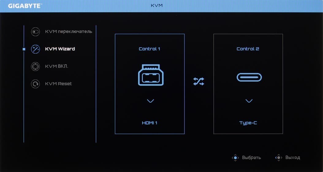Есть встроенный концентратор USB (USB 3.2 Gen 1) на два порта. В наличие также функция KVM — к монитору по USB можно подключить клавиатуру и мышь (а можно и накопитель), чтобы затем их использовать с двумя источниками видеосигнала, например, с ПК и ноутбуком, или с ПК и планшетом. При этом один из источников должен быть подключен по USB-C (ввод видеосигнала по этому же интерфейсу, или по DisplayPort, или по HDMI), а второй — по USB через разъем USB-B (ввод видеосигнала или по DisplayPort, или по HDMI). Источники переключаются отдельной кнопкой, выбором пункта в меню настроек монитора и в приложении Gigabyte Control Center. Также порты USB переключаются автоматически выбором соответствующего видеовхода.