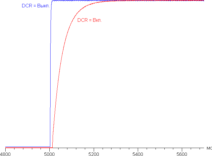 Если включить режим DCR (Динамическая контрастность), то работает глобальная (на всю площадь экрана) подстройка яркости — на очень темных сценах яркость подсветки уменьшается, а на черном поле во весь экран через секунду подсветка отключается совсем. Такая подстройка яркости подсветки может улучшить восприятие темных сцен. График ниже показывает, как увеличивается яркость (вертикальная ось) при переключении с черного поля (после пяти секунд вывода) на белое при выключенной и включенной динамической подстройке яркости: