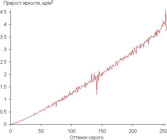 Реальная гамма-кривая ближе всего к стандартной при выборе варианта Гамма = 2.2, поэтому далее мы измерили яркость 256 оттенков серого (от 0, 0, 0 до 255, 255, 255) при этом значении. График ниже показывает прирост (не абсолютное значение!) яркости между соседними полутонами: