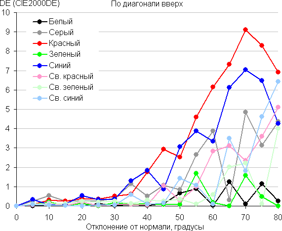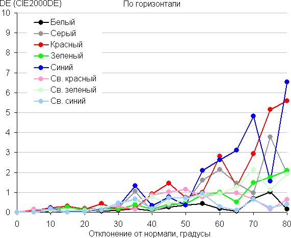 Для количественной характеристики изменения цветопередачи мы провели колориметрические измерения для белого, серого (127, 127, 127), красного, зеленого и синего, а также светло-красного, светло-зеленого и светло-синего полей во весь экран с использованием установки, подобной той, что применялась в предыдущем тесте. Измерения проводились в диапазоне углов от 0° (датчик направлен перпендикулярно к экрану) до 80° с шагом в 5°. Полученные значения интенсивностей были пересчитаны в ΔE относительно замера каждого поля при перпендикулярном положении датчика относительно экрана. Результаты представлены ниже: