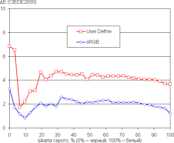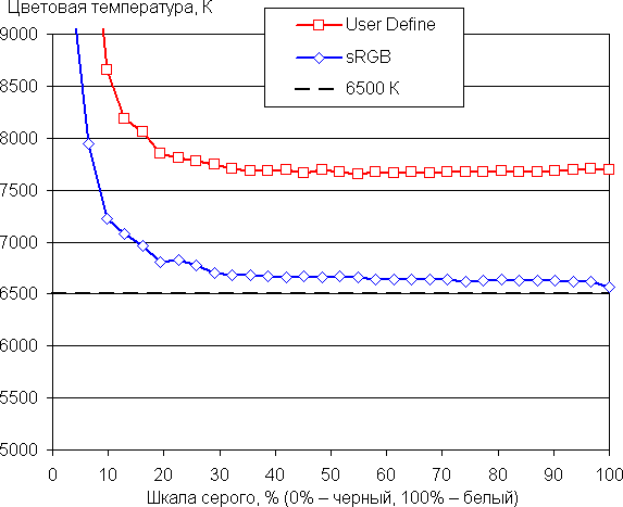Цветовой баланс просто при выборе профиля User Define (Определяется пользователем) для настройки Цветовая температура, который обеспечивает максимальную яркость и контрастность с сохранением приемлемого качества изображения, хороший, так как цветовая температура не сильно выше стандартных 6500 К, и отклонение от спектра абсолютно черного тела (параметр ΔE) ниже 10. После выбора профиля sRGB баланс лучше, за счет снижения цветовой температуры и ΔE. Графики ниже показывают цветовую температуру на различных участках шкалы серого и ΔE для профилей User Define без коррекции и sRGB.