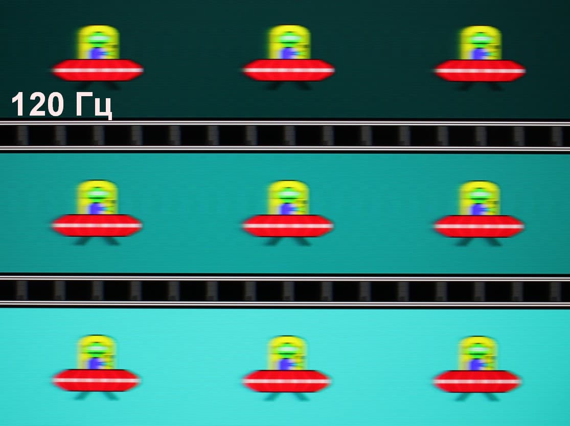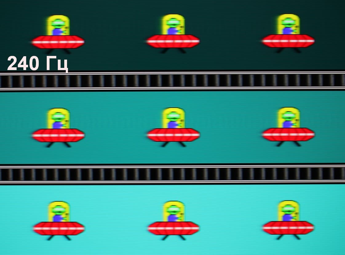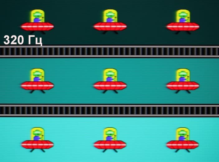 Попробуем представить, что было бы в случае матрицы с мгновенным переключением пикселей. Для нее при 60 Гц объект со скоростью движения 960 пиксель/с размывается на 16 пикселей, при 120 Гц — на 8, при 240 Гц — на 4, при 320 Гц — на 3. Размывается, так как фокус зрения движется с указанной скоростью, а объект неподвижно выводится на 1/60, 1/120, 1/240 или 1/320 секунды. Для иллюстрации этого сымитируем размытие на соответствующее количество пикселей: