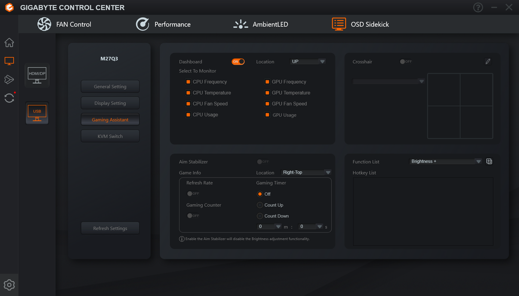 Монитором можно управлять с ПК с помощью фирменного ПО Gigabyte Control Center на вкладке Sidekick. Кроме настроек, доступных из меню монитора, в этом ПО можно задавать клавиатурные сокращения для ряда настроек и для увеличения и уменьшения значения пользовательского счетчика. Что им полезно будет считать — зависит от игры. Только при запущенной Gigabyte Control Center на монитор выводятся данные на Информационную панель.