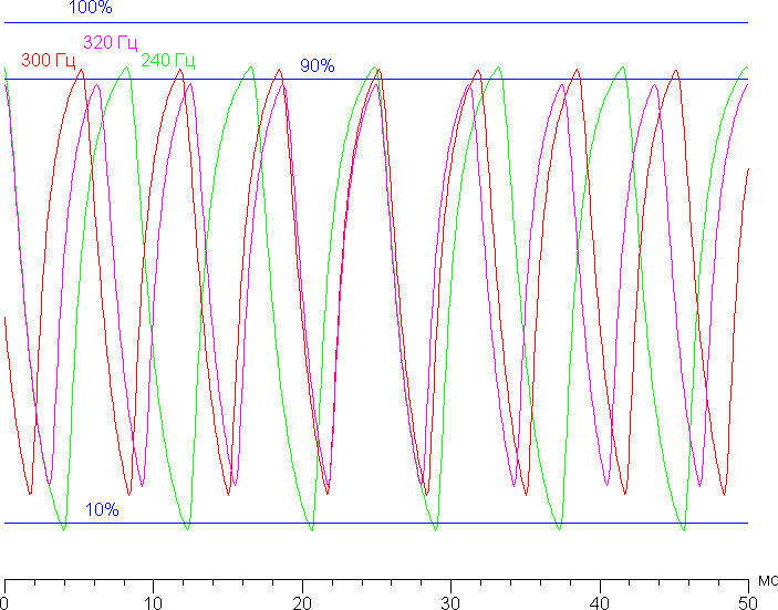 Видно, что при 320 Гц чередования максимальная яркость белого кадра ниже уровня 90% белого, а минимальная яркость черного кадра выше 10%. Амплитуда изменения яркости меньше 80% от уровня белого. То есть согласно этому формальному критерию скорости матрицы недостаточно для вывода изображения с кадровой частотой 320 Гц. При 240 Гц уже достаточно.