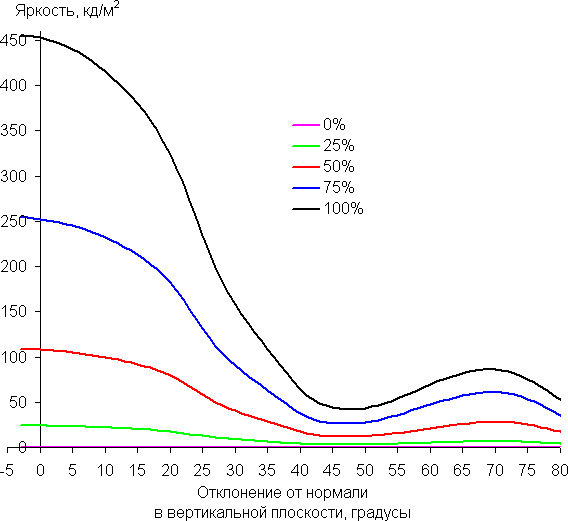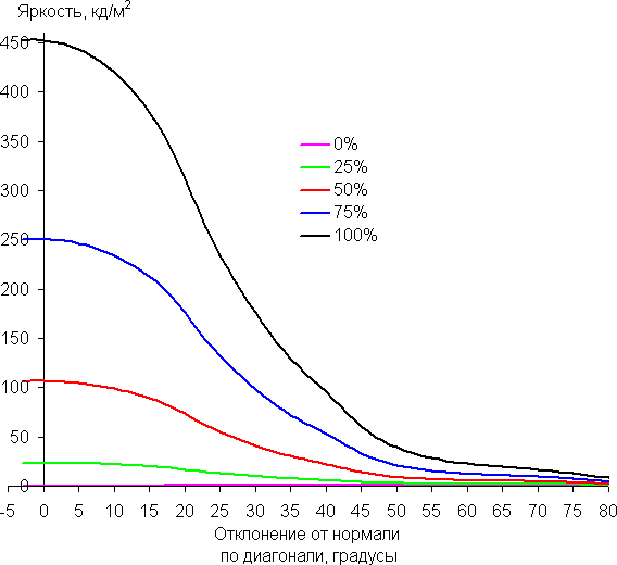 Углы обзора по снижению яркости неширокие. При отклонении в диагональном направлении яркость черного поля начинает быстро возрастать уже при 15° отклонения от перпендикуляра к экрану. Если сидеть не очень далеко от экрана, то черное поле по углам будет немного светлее, чем в центре, и иметь фиолетовый оттенок. Однако яркость черного поля повышается максимум до примерно 1,5% от яркости белого поля. Для матрицы типа IPS это отличный результат. Контрастность в диапазоне углов ±82° в случае отклонения по диагонали вплотную приближается к отметке 10:1, но все же не опускается ниже.
