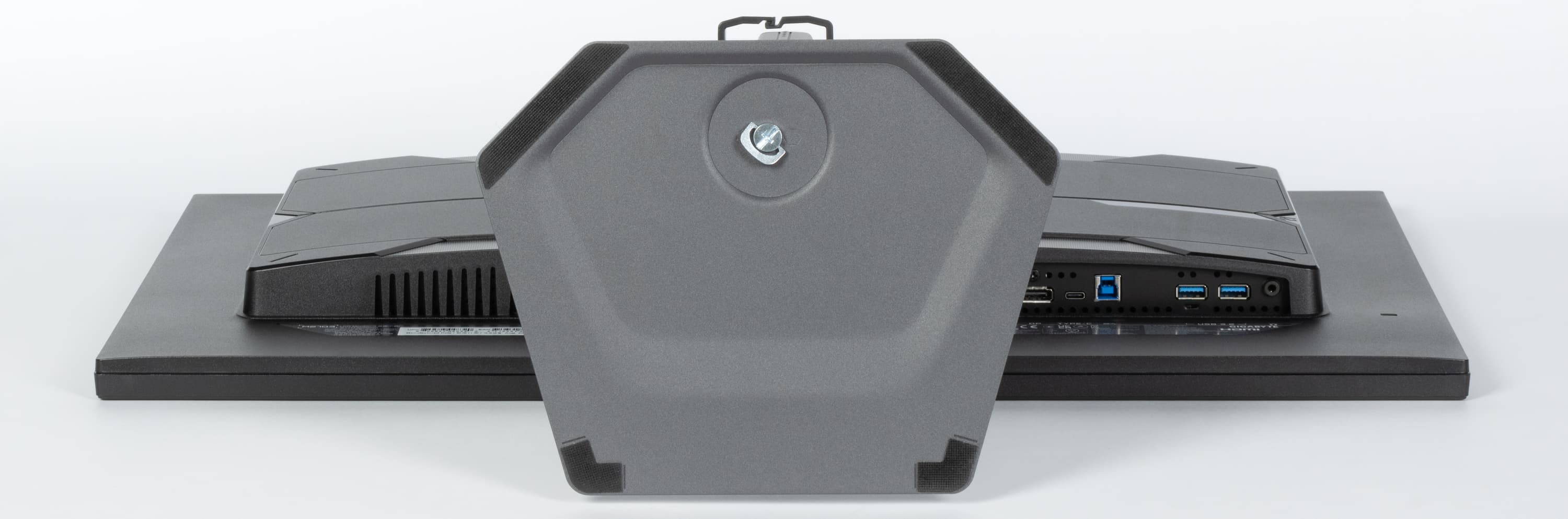 Дополнительно поворотный узел в нижнем торце стойки подставки обеспечивает поворот стойки с блоком экрана вправо-влево. Подставка на блок экрана крепится на защелках одним движением, а отсоединяется также просто, при удерживании движка фиксатора. При необходимости подставку можно отсоединить и закрепить блок экрана на VESA-совместимом кронштейне (площадка 100 на 100 мм).
