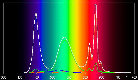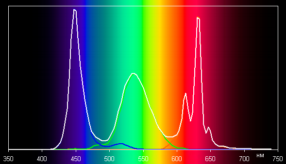 Ниже приведен спектр для белого поля (белая линия), наложенный на спектры красного, зеленого и синего полей (линии соответствующих цветов) в случае исходного цветового охвата: