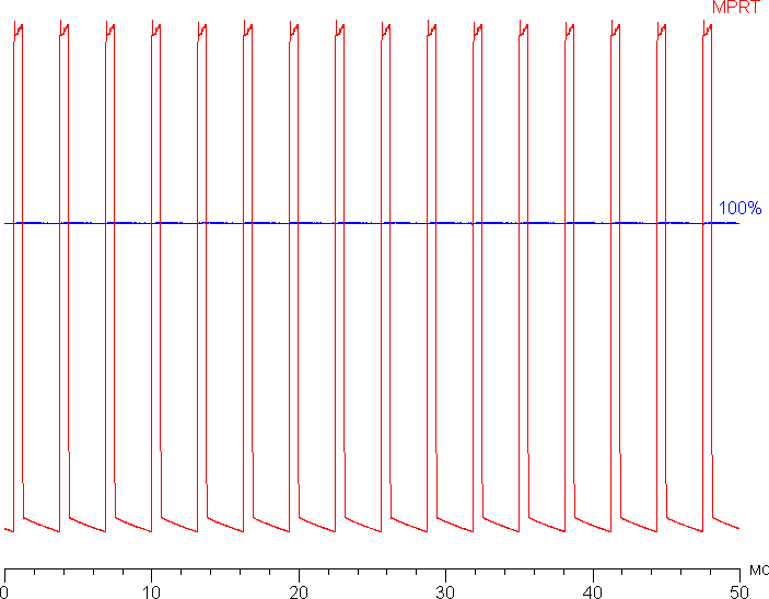 Приведем зависимость яркости от времени при чередовании белого и черного кадра при 320 Гц кадровой частоты. Яркость белого поля — это 100% на графике: