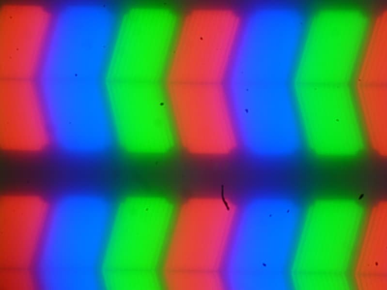 Изображение структуры пикселей из-за матовой поверхности размыто, но характерную для IPS структуру при желании распознать можно (черные точки — это пыль на матрице фотоаппарата):