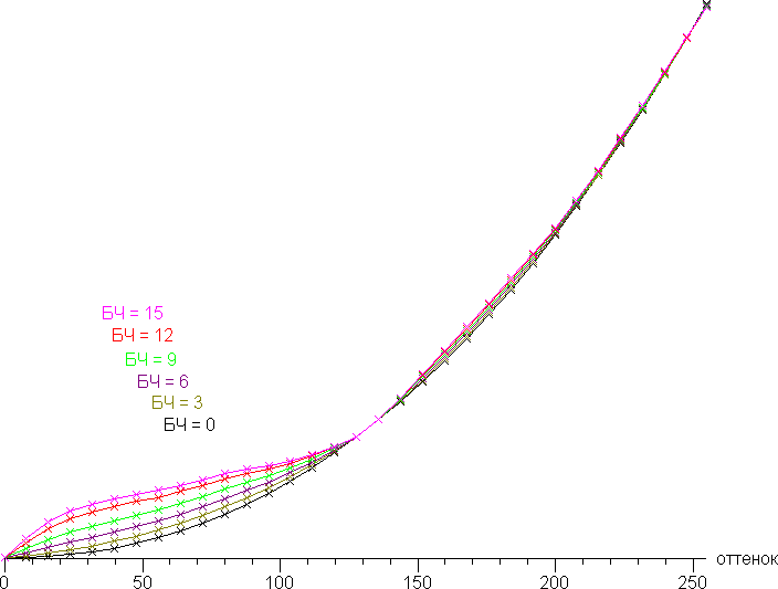 Дополнительной настройкой AI Баланс черного (сократим до БЧ; значения от 0 до 15 с шагом 1, по умолчанию 0) можно скорректировать гамма-кривую, улучшая различимость деталей в тенях. Это может быть полезно в играх с темными сценами. Ниже приведены гамма-кривые при нескольких значениях AI Баланс черного (построенные по 32 точкам):