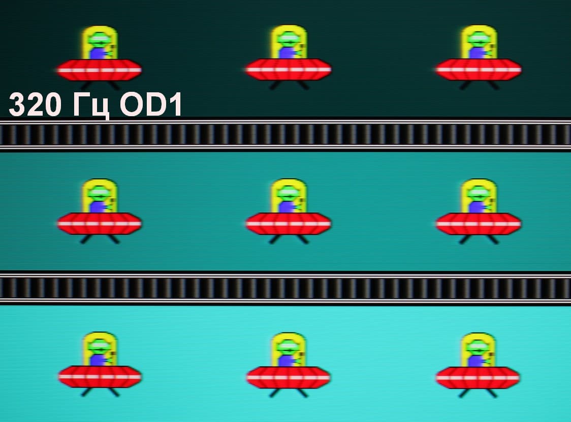 Видно, что при прочих равных условиях четкость изображения повышается по мере роста частоты обновления и степени разгона, но на максимальном разгоне артефакты уже очень заметные. Включение Aim Stabilizer Sync увеличивает четкость вплоть до одного пикселя по горизонтали, но объекты в движении приобретают паразитные копии со снижающейся яркостью, что снижает положительный эффект. С нашей точки зрения оптимальным по четкости является режим 320 Гц со средним разгоном при выключенной функции Aim Stabilizer Sync.