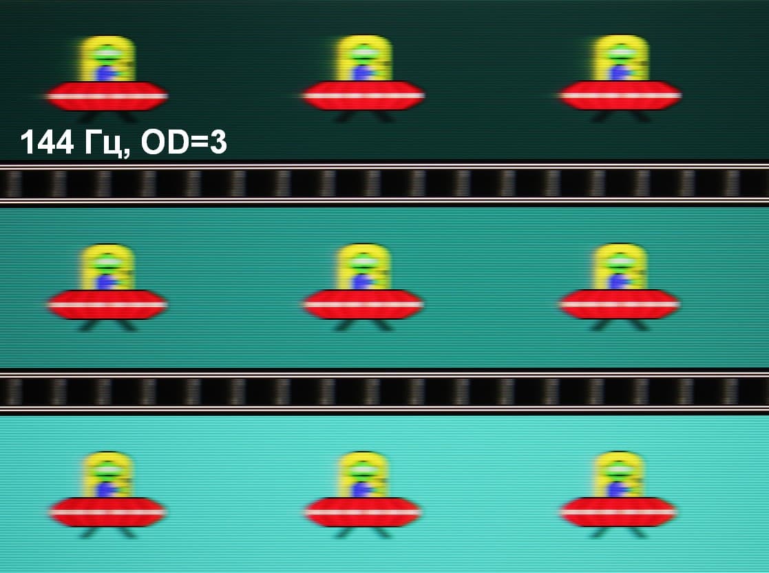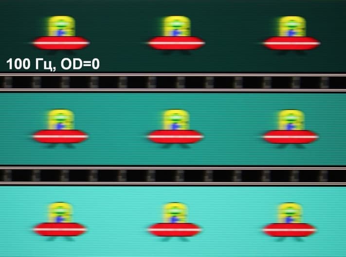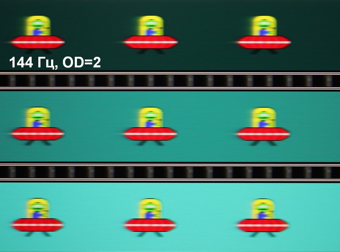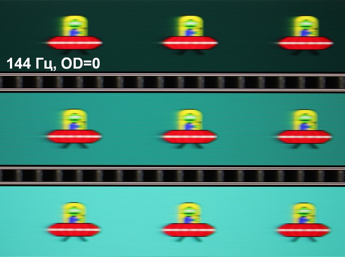 Для наглядного представления о том, что на практике означает такая скорость матрицы, какие могут быть артефакты от разгона и повышает ли четкость в движении, описанная выше настройка Aim Stabilizer Sync, приведем серию снимков, полученных с помощью движущейся камеры. Такие снимки показывают, что видит человек, если он следит глазами за двигающимся на экране объектом. Описание теста приведено тут, страница с самим тестом тут. Использовались рекомендованные установки (скорость движения 960, 1000 и 1008 пиксель/с для частот обновления 60, 100 и 144 Гц), выдержка 1/15 с, на фотографиях указаны значения частоты обновления, а также ступень разгона (ODx) и включен ли режим Aim Stabilizer Sync (BFI).