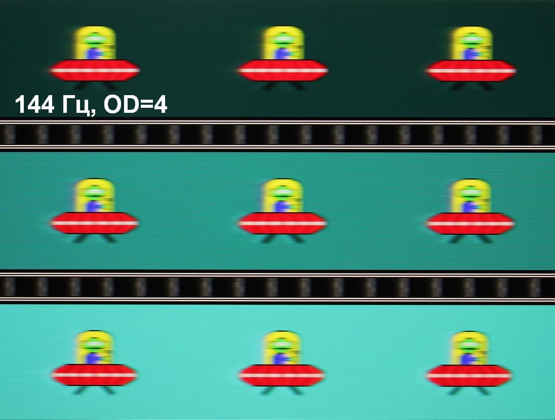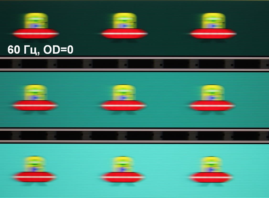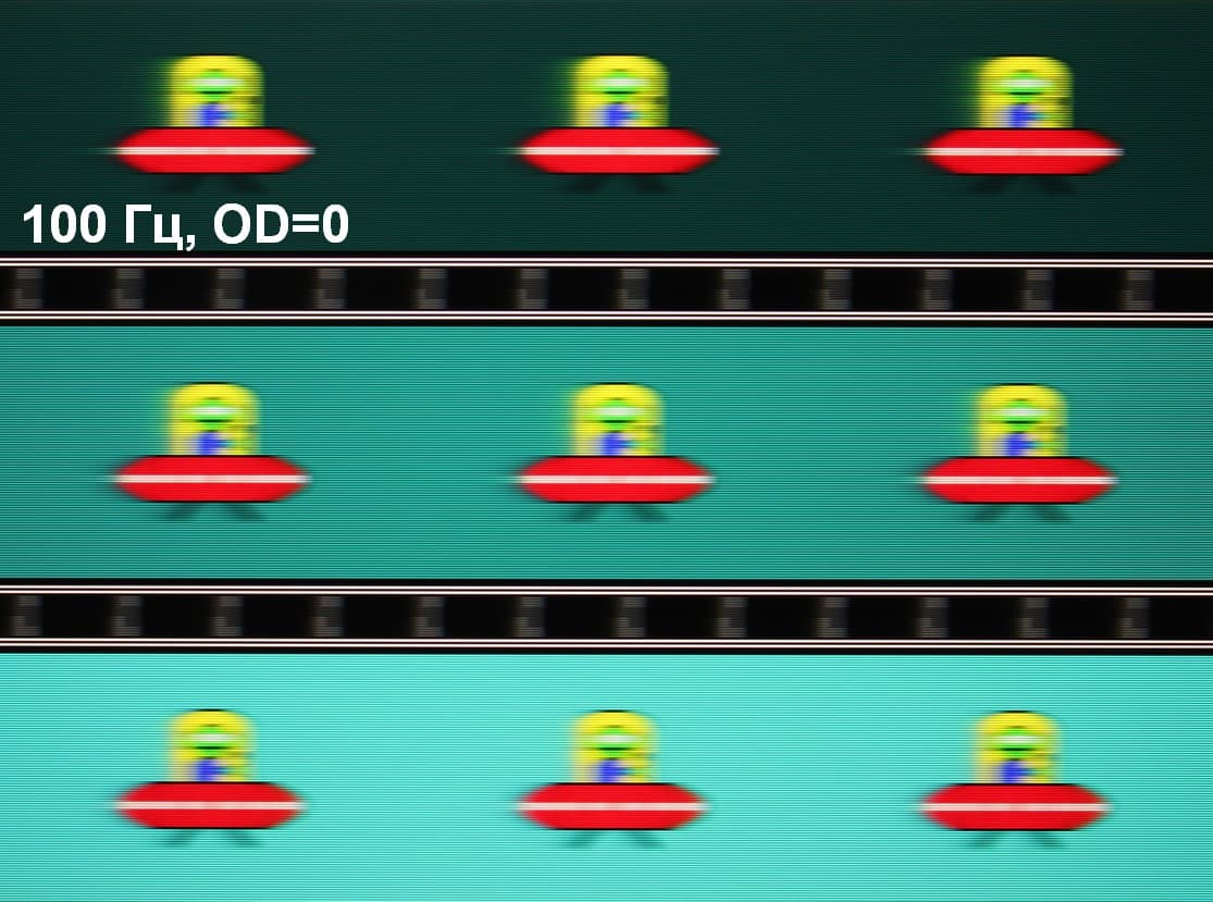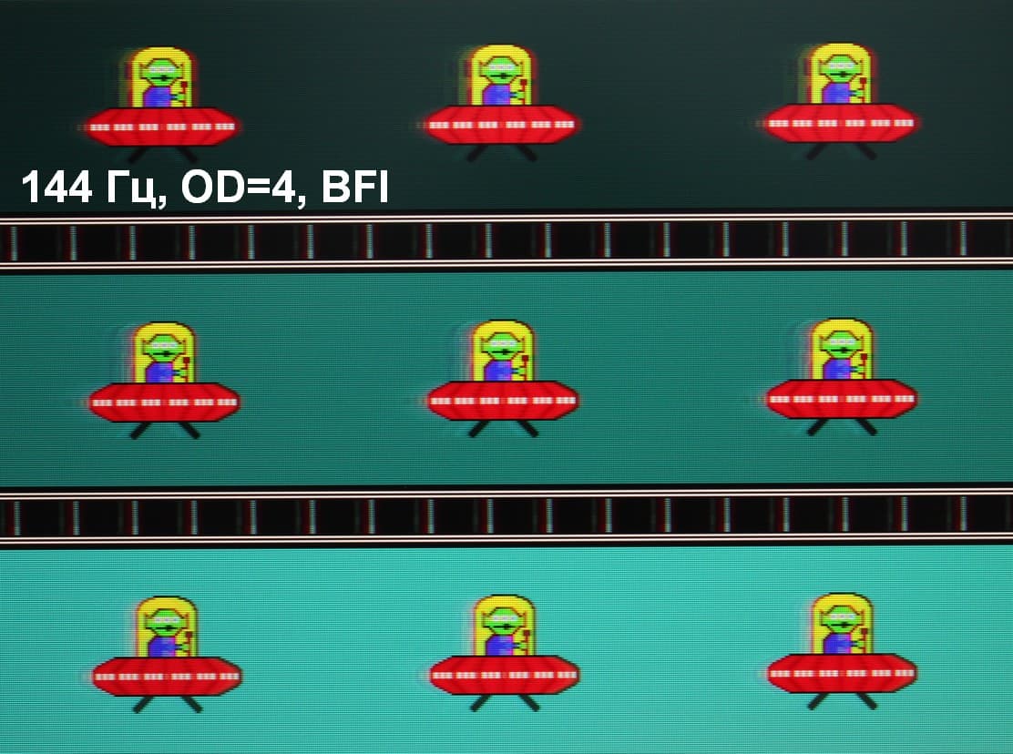 Для наглядного представления о том, что на практике означает такая скорость матрицы, какие могут быть артефакты от разгона и повышает ли четкость в движении, описанная выше настройка Aim Stabilizer Sync, приведем серию снимков, полученных с помощью движущейся камеры. Такие снимки показывают, что видит человек, если он следит глазами за двигающимся на экране объектом. Описание теста приведено тут, страница с самим тестом тут. Использовались рекомендованные установки (скорость движения 960, 1000 и 1008 пиксель/с для частот обновления 60, 100 и 144 Гц), выдержка 1/15 с, на фотографиях указаны значения частоты обновления, а также ступень разгона (ODx) и включен ли режим Aim Stabilizer Sync (BFI).