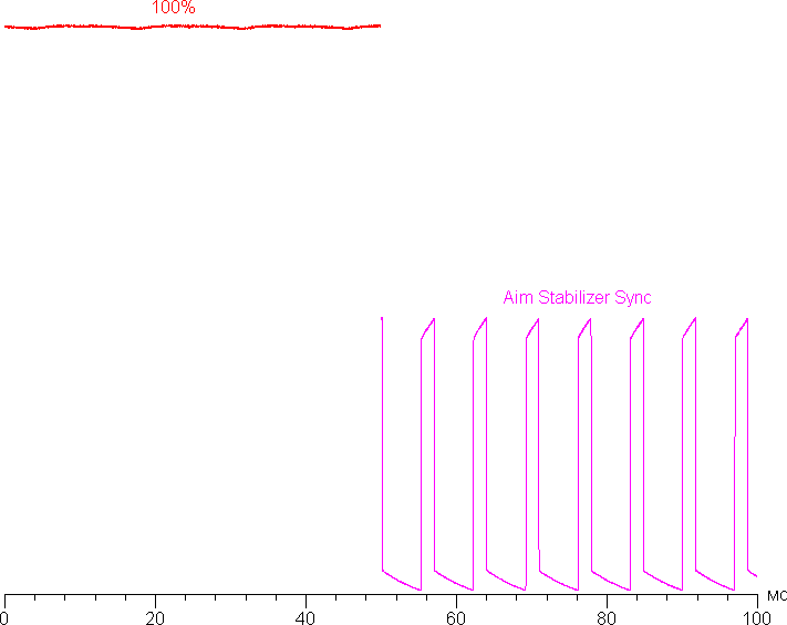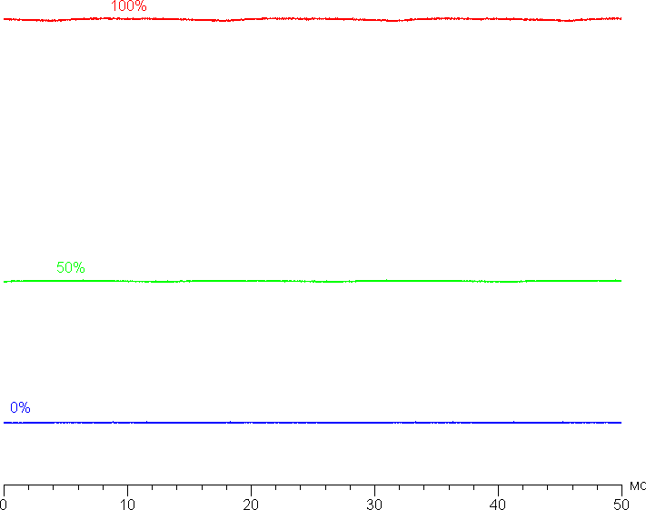 Яркость монитора меняется именно яркостью подсветки, то есть без ущерба для качества изображения (сохраняется контрастность и количество различимых градаций) яркость монитора можно менять в довольно широких пределах, что позволяет с комфортом играть, работать и смотреть фильмы как в освещенном, так и в темном помещении, хотя для последнего случая минимальная яркость кому-то может показаться высоковатой. На любом уровне яркости значимая модуляция подсветки отсутствует, что исключает видимое мерцание экрана. Для тех, кто привык распознавать знакомое сокращение, уточним: ШИМ отсутствует. В доказательство приведем графики зависимости яркости (вертикальная ось) от времени (горизонтальная ось) при различных значениях настройки яркости:
