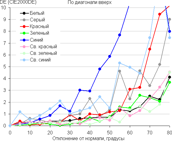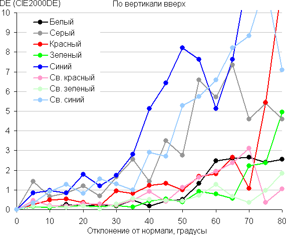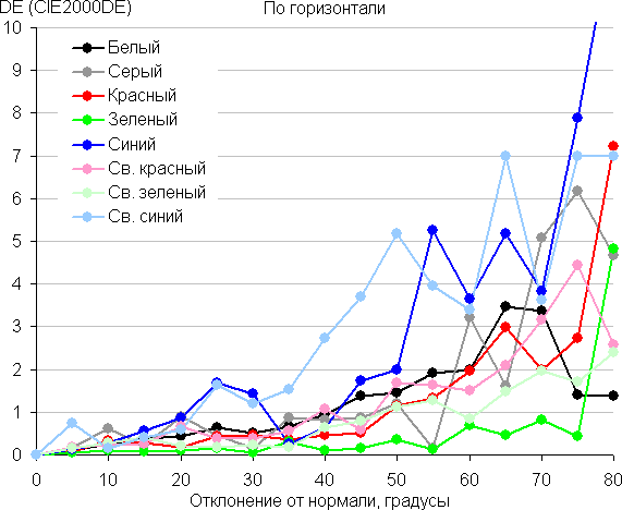 Для количественной характеристики изменения цветопередачи мы провели колориметрические измерения для белого, серого (127, 127, 127), красного, зеленого и синего, а также светло-красного, светло-зеленого и светло-синего полей во весь экран с использованием установки, подобной той, что применялась в предыдущем тесте. Измерения проводились в диапазоне углов от 0° (датчик направлен перпендикулярно к экрану) до 80° с шагом в 5°. Полученные значения интенсивностей были пересчитаны в ΔE относительно замера каждого поля при перпендикулярном положении датчика относительно экрана. Результаты представлены ниже: