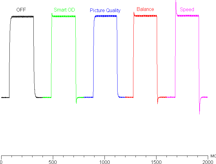 Ниже приведены графики полутонового перехода между оттенками 40% и 60% и обратно при различных значениях настройки Overdrive (по вертикали — яркость, по горизонтали — время, для наглядности графики выстроены последовательно):