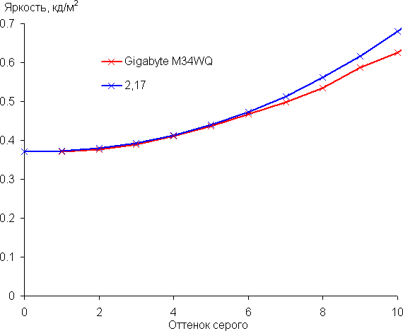 Рост прироста яркости весьма равномерный. При этом каждый следующий оттенок значимо ярче предыдущего, за исключение первого ближайшего к черному оттенка серого, который по яркости от черного не отличается: