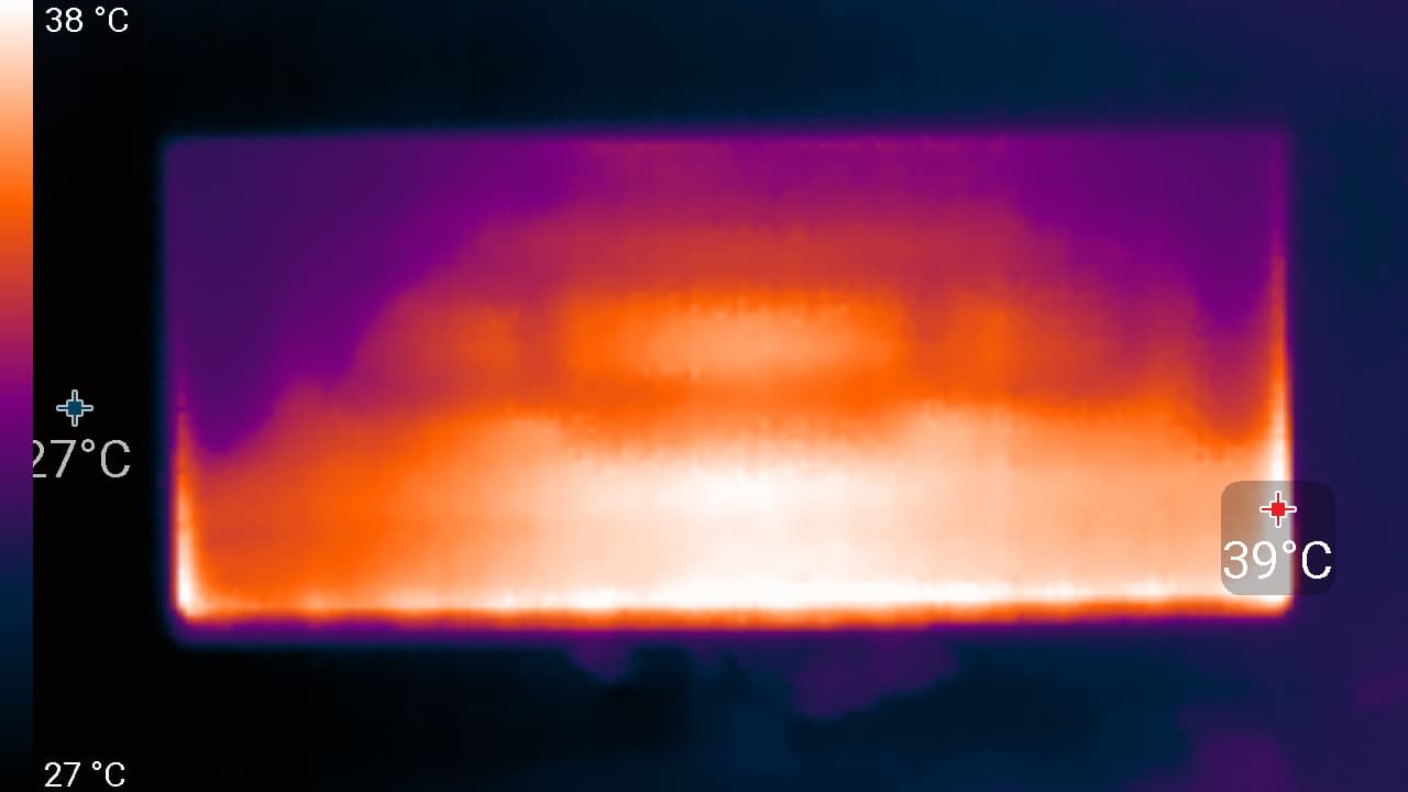 Видимо, внизу находится светодиодная линейка подсветки экрана. Нагрев сзади умеренный.