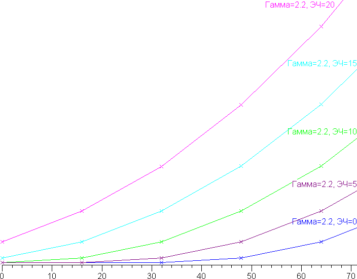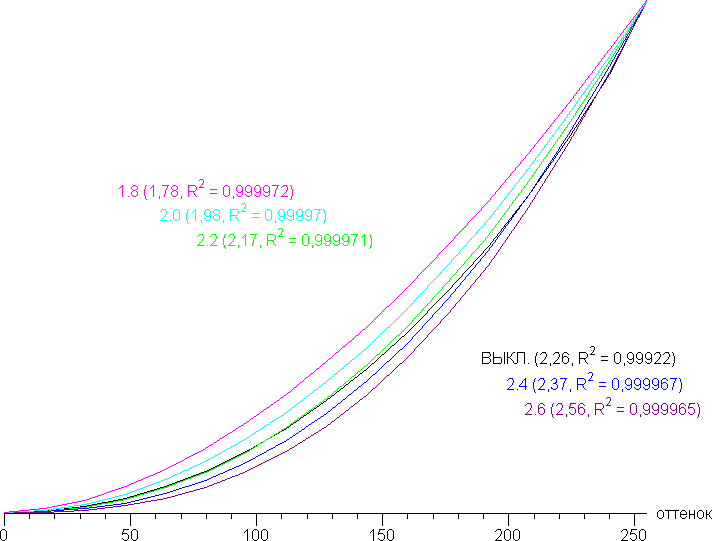 Реальная гамма-кривая зависит от выбранного значения списке Gamma (Гамма). Значения показателей аппроксимирующей функции приведены в скобках в подписях, там же — коэффициент детерминации R2: