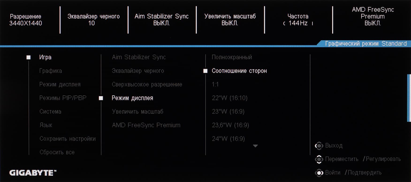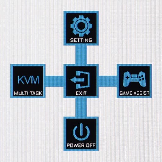 Если на экране оно, то нажатие на джойстик — выход из меню, отклонение вниз — выключение монитора (его можно выключить и без меню длительным нажатием на джойстик), вверх — вход в основное меню установок, вправо — меню с настройками игровых функций, влево — меню KVM.