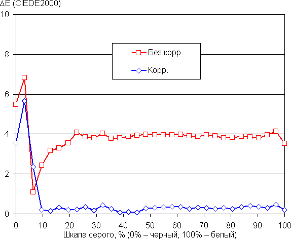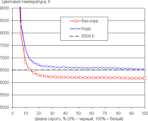 Цветовой баланс просто при выборе профиля User Define (Определяется пользователем) для настройки Color Temp., который обеспечивает максимальную яркость и контрастность с сохранением приемлемого качества изображения, хороший, так как цветовая температура близка к стандартным 6500 К, и отклонение от спектра абсолютно черного тела (параметр ΔE) невелико. После коррекции баланс еще лучше и отвечает критериям профессиональных мониторов. Графики ниже показывают цветовую температуру на различных участках шкалы серого и ΔE для профиля User Define без коррекции и после (95/95/100 для усиления R/G/B).