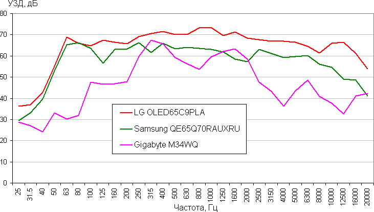Встроенные громкоговорители звучат согласно их размерам и акустическому окружению — настолько громко, чтобы сидящий перед монитором пользователь уверенно расслышал системные сигналы, без низких частот вообще, с выраженным «пластиковым» призвуком из-за резонансов корпуса, зато с очень хорошо выраженным стереофоническим эффектом. Сравним АЧХ этого монитора с АЧХ двух телевизоров высшего класса (воспроизводился розовый шум, уровни звукового давления в 1/3 октавах записывал шумомер Октава-110А-Эко):