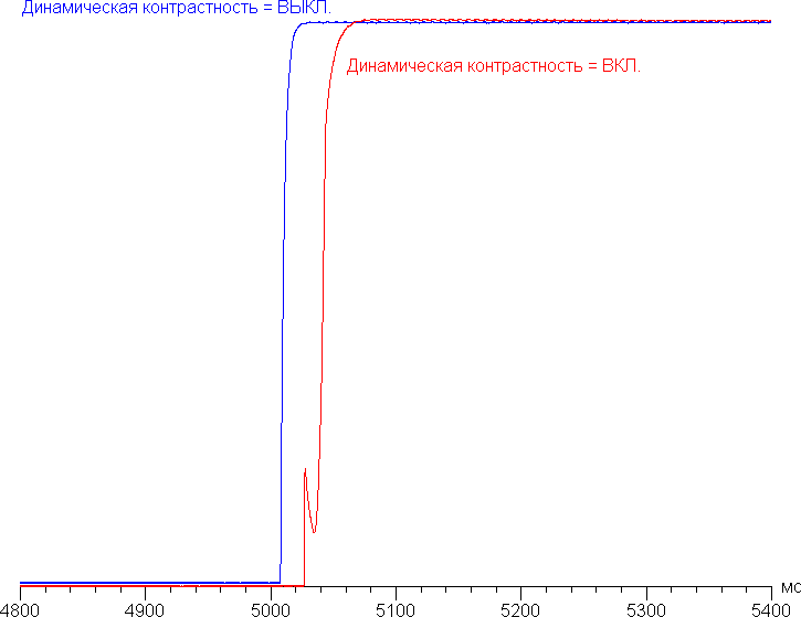Если включить режим DCR (Динамическая контрастность), то работает глобальная (на всю площадь экрана) подстройка яркости — на темных сценах яркость подсветки уменьшается, а на черном поле во весь экран подсветка отключается совсем, но белого курсора мыши достаточно для включения подсветки. Такая подстройка яркости подсветки может улучшить восприятие темных сцен. График ниже показывает, как увеличивается яркость (вертикальная ось) при переключении с черного поля (после пяти секунд вывода) на белое при выключенной и включенной динамической подстройке яркости: