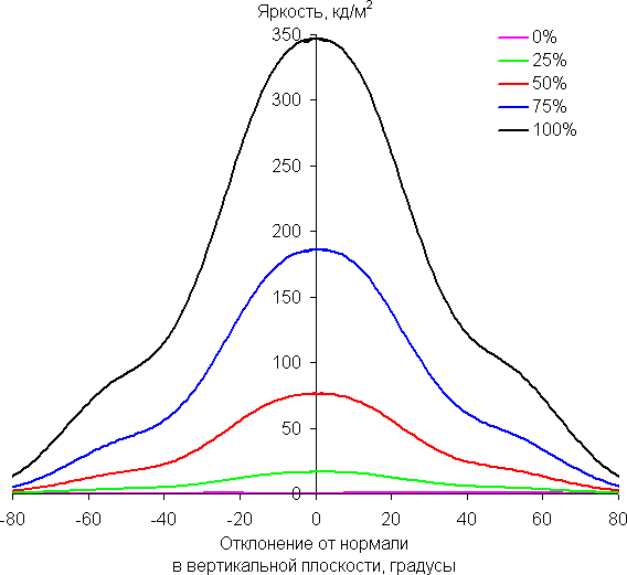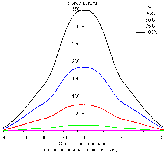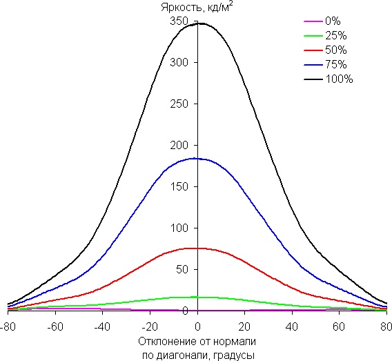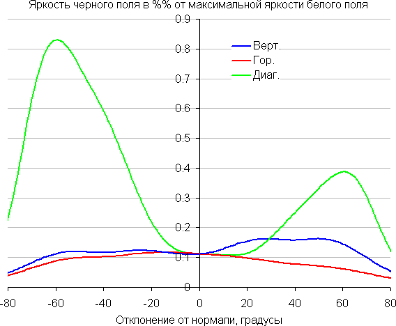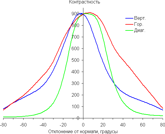 Углы обзора по снижению яркости не очень широкие. При отклонении в диагональном направлении яркость черного поля начинает резко возрастать уже при 20°-30° отклонения от перпендикуляра к экрану. Если сидеть не очень далеко от экрана, то черное поле по углам будет заметно светлее, чем в центре. Контрастность в диапазоне углов ±82° в случае отклонения по диагонали приближается к отметке 10:1, и опускается ниже при отклонении в одном направлении более чем на 73°.