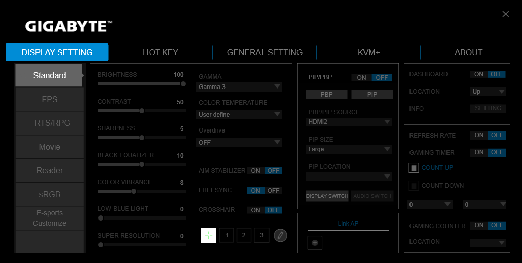 Монитором можно управлять с ПК с помощью фирменного ПО OSD Sidekick. Кроме настроек, доступных из меню монитора, в OSD Sidekick можно сохранять/загружать профили, редактировать форму перекрестия прицела, задавать клавиатурные сокращения, настраивать и переключать KVM и обновлять микропрограмму монитора. Только при запущенной OSD Sidekick на монитор выводятся данные на панель Dashboard. И именно в OSD Sidekick задаются клавиатурные сокращения, которым пользователь может увеличивать и уменьшать значение пользовательского счетчика. Что им полезно будет считать — зависит от игры.