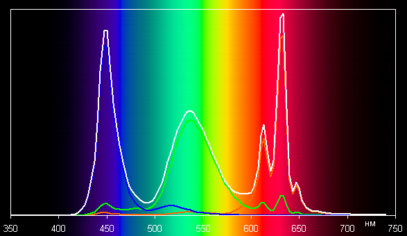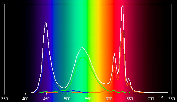Можно предположить, что в светодиодах подсветки применяется синий излучатель и зеленый и красный люминофоры, при этом в красном люминофоре (а может и в зеленом) используются так называемые квантовые точки. Хорошее разделение компонент позволяет получить уширенный цветовой охват. В случае профиля sRGB с корректировкой цветового охвата компоненты подмешиваются друг к другу в значительной степени: