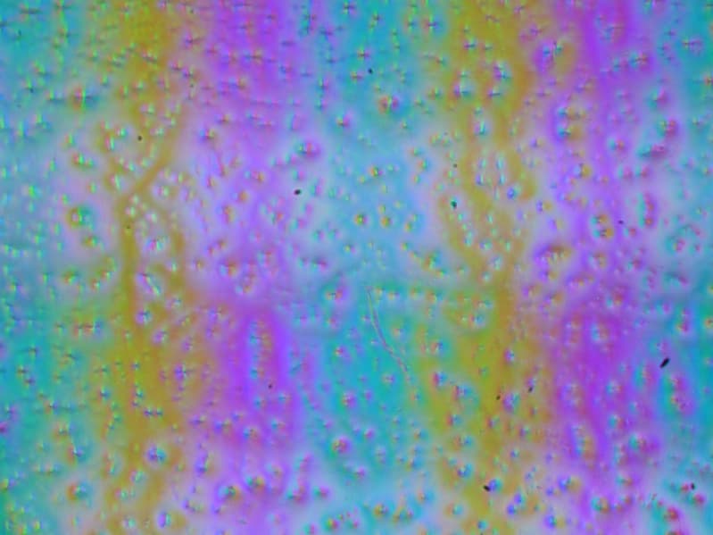 Зерно этих дефектов в несколько раз меньше размеров субпикселей (масштаб этих двух фотографий одинаковый), поэтому фокусировка на микродефектах и «перескок» фокуса по субпикселям при изменении угла зрения выражены слабо, из-за этого нет и «кристаллического» эффекта.