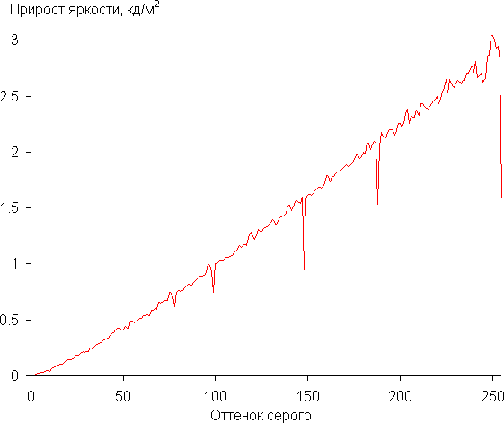 Реальная гамма-кривая ближе всего к стандартной при выборе варианта Гамма 2.2, поэтому далее мы измерили яркость 256 оттенков серого (от 0, 0, 0 до 255, 255, 255) при этом значении. График ниже показывает прирост (не абсолютное значение!) яркости между соседними полутонами: