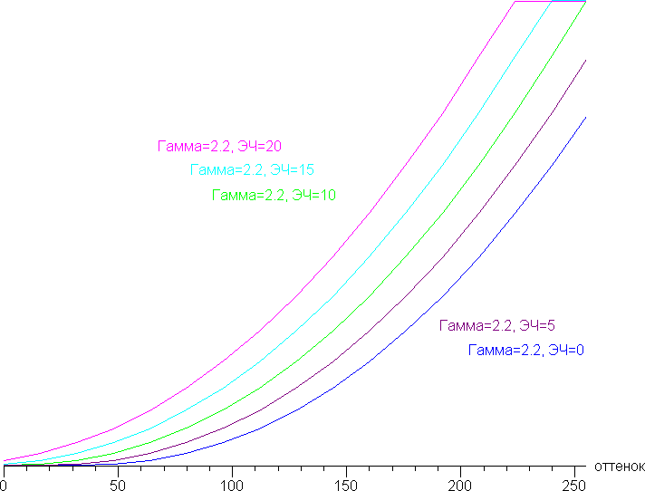 Дополнительной настройкой Black Equalizer (или Эквалайзер черного (ЭЧ) значения от 0 до 20, по умолчанию 10) можно скорректировать гамма-кривую, улучшая различимость деталей в тенях. Это может быть полезно в играх с темными сценами. Ниже приведены гамма-кривые при нескольких значениях Black Equalizer (построенные по 16 точкам):