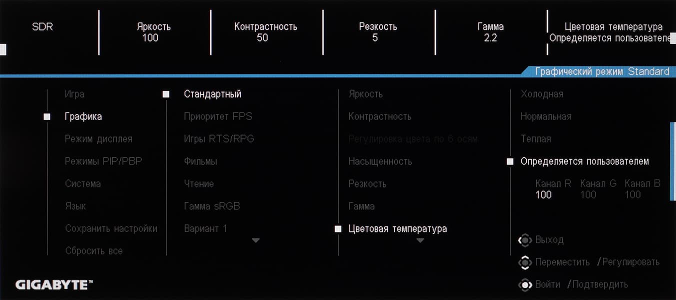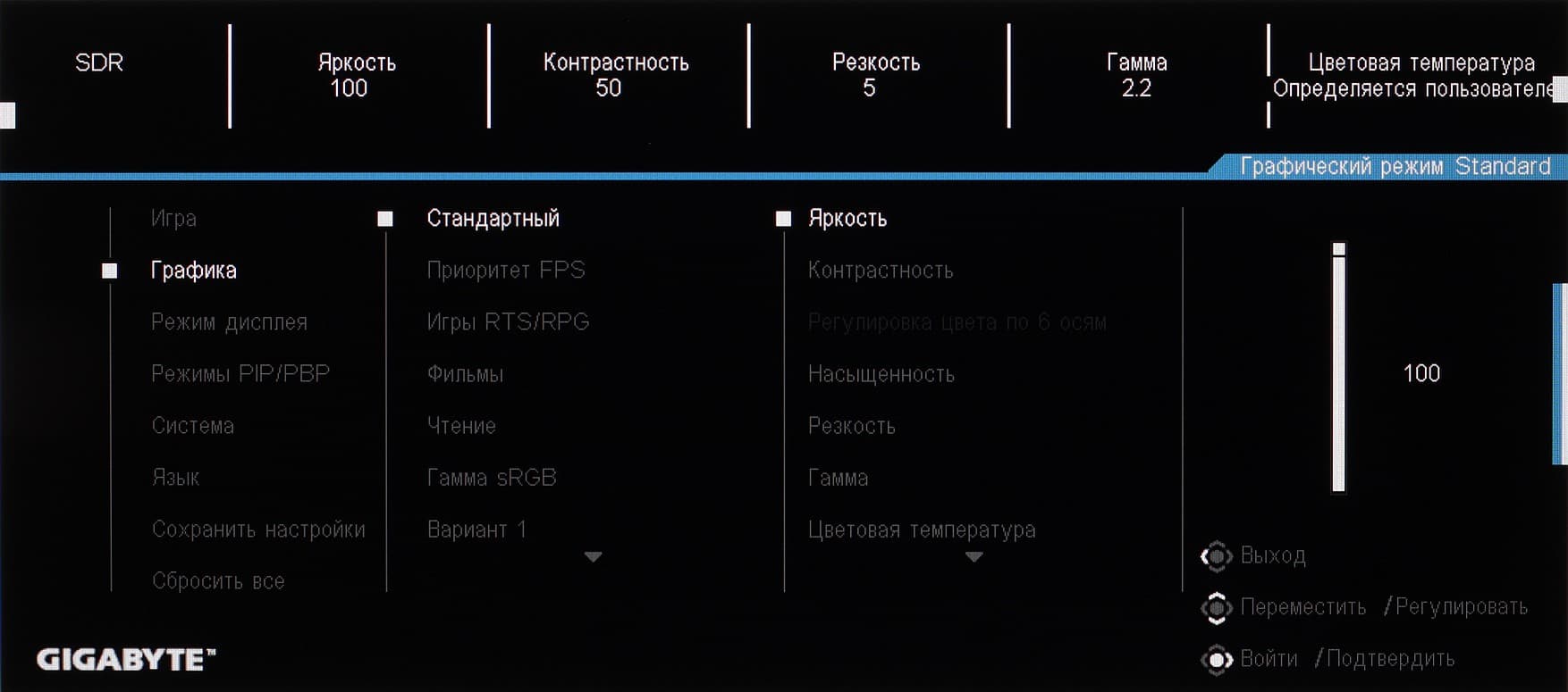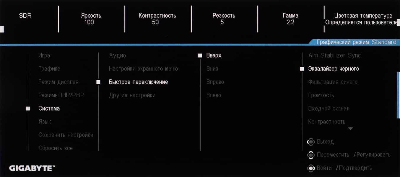 Навигация по меню очень удобная, так как все делается только джойстиком, не нужно переносить палец на кнопки, и количество необходимых действий разумно сокращено, к тому же списки зациклены. При настройке изображения меню остается на экране — это несколько мешает оценке вносимых изменений. При необходимости можно установить уровень прозрачности фона меню, выбрать тайм-аут автоматического выхода из меню и включить блокировку меню, что предотвращает случайное изменение настроек. Есть русская версия экранного меню. Качество перевода на русский язык среднее, есть ошибки и неточности, поэтому в тексте мы местами используем английские названия настроек. Напечатанной документации в комплекте поставки — самый минимум. Полные руководства пользователя в виде PDF-файлов можно найти на сайте Gigabyte.