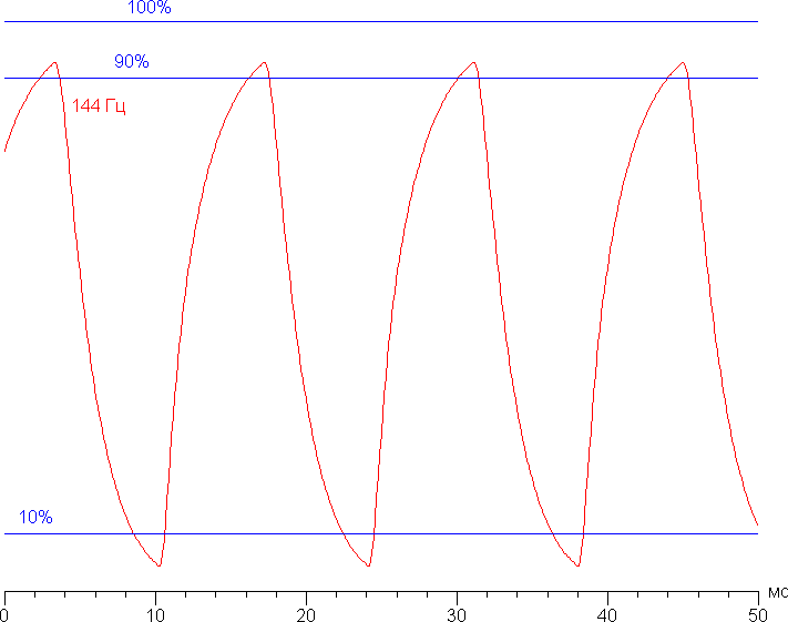 Видно, что при 144 Гц чередования максимальная яркость белого кадра выше уровня 90% белого, а минимальная яркость черного кадра ниже 10%. Амплитуда изменения яркости больше 80% от уровня белого. То есть согласно этому формальному критерию скорости матрицы достаточно для вывода изображения с кадровой частотой 144 Гц.