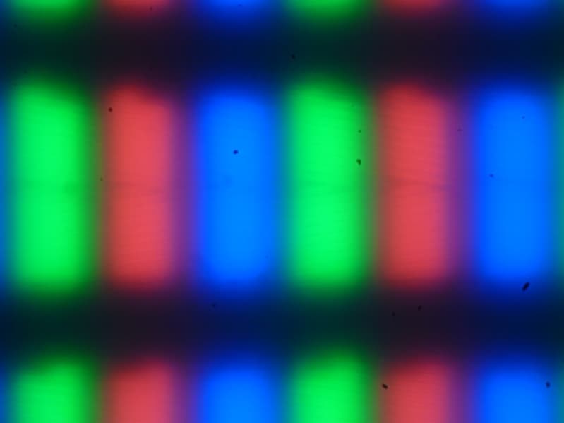 Изображение структуры пикселей из-за матовой поверхности слегка размыто, но характерную для IPS структуру распознать можно (черные точки — это пыль на матрице фотоаппарата):