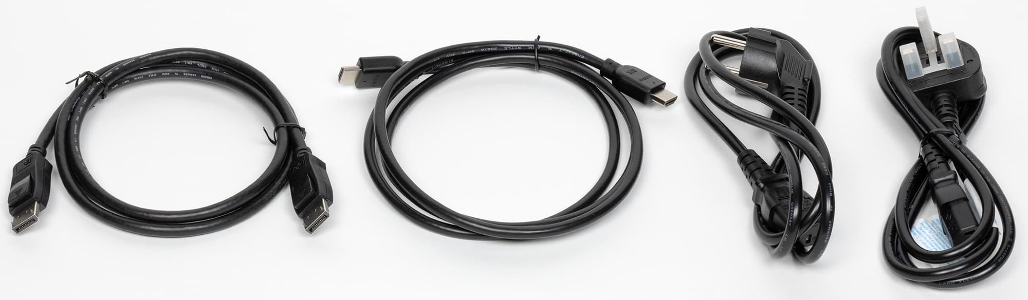 К монитору прилагается неплохой комплект кабелей (но не очень длинных) черного цвета (еще должен быть кабель USB (3.0), вилка типа A на тип B, но ниже на фотографии его нет).