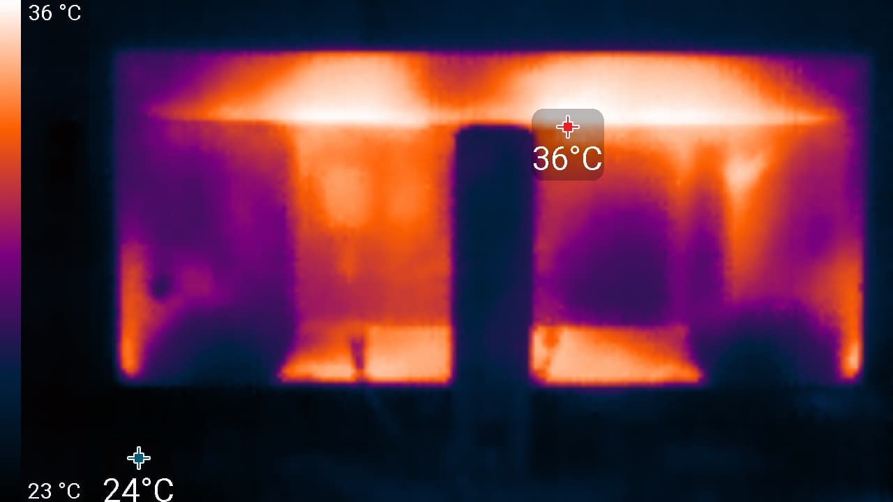 Нагрев монитора можно оценить по приведенному снимку с ИК-камеры, полученному после долговременной работы монитора на максимальной яркости (режим HDR) в помещении с температурой примерно 24 °C:
