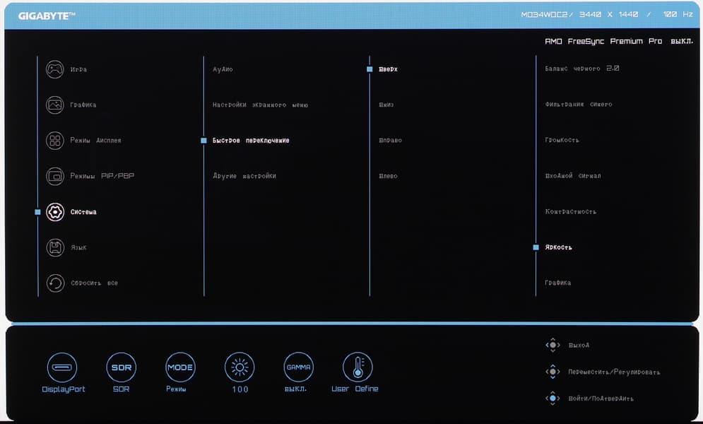 Если на экране оно, то нажатие на джойстик — выход из меню, отклонение вниз — выключение монитора, вверх — вход в основное меню установок, вправо — меню с настройками игровых функций, влево — функции OLED Care.