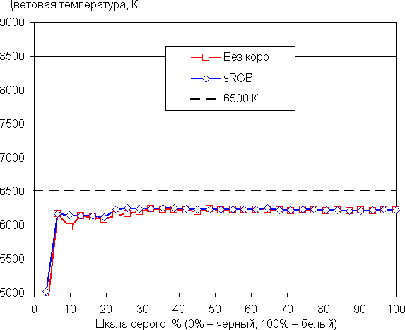 Самый близкий к черному диапазон можно не учитывать, так как в нем цветопередача не так важна, а погрешность измерения цветовых характеристик высокая. Цветовой баланс во всех двух случаях хороший, так как цветовая температура достаточно близка к стандартным 6500 К и отклонение от спектра абсолютно черного тела (ΔE) ниже 10 единиц, что для потребительского устройства считается приемлемым показателем. При этом оба параметра мало изменяются на различных участках шкалы серого, что улучшает визуальное восприятие цветового баланса.