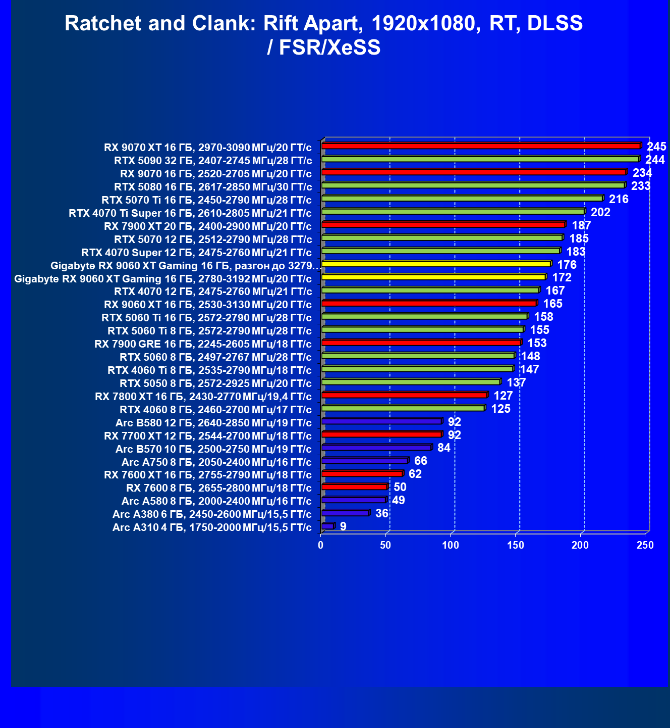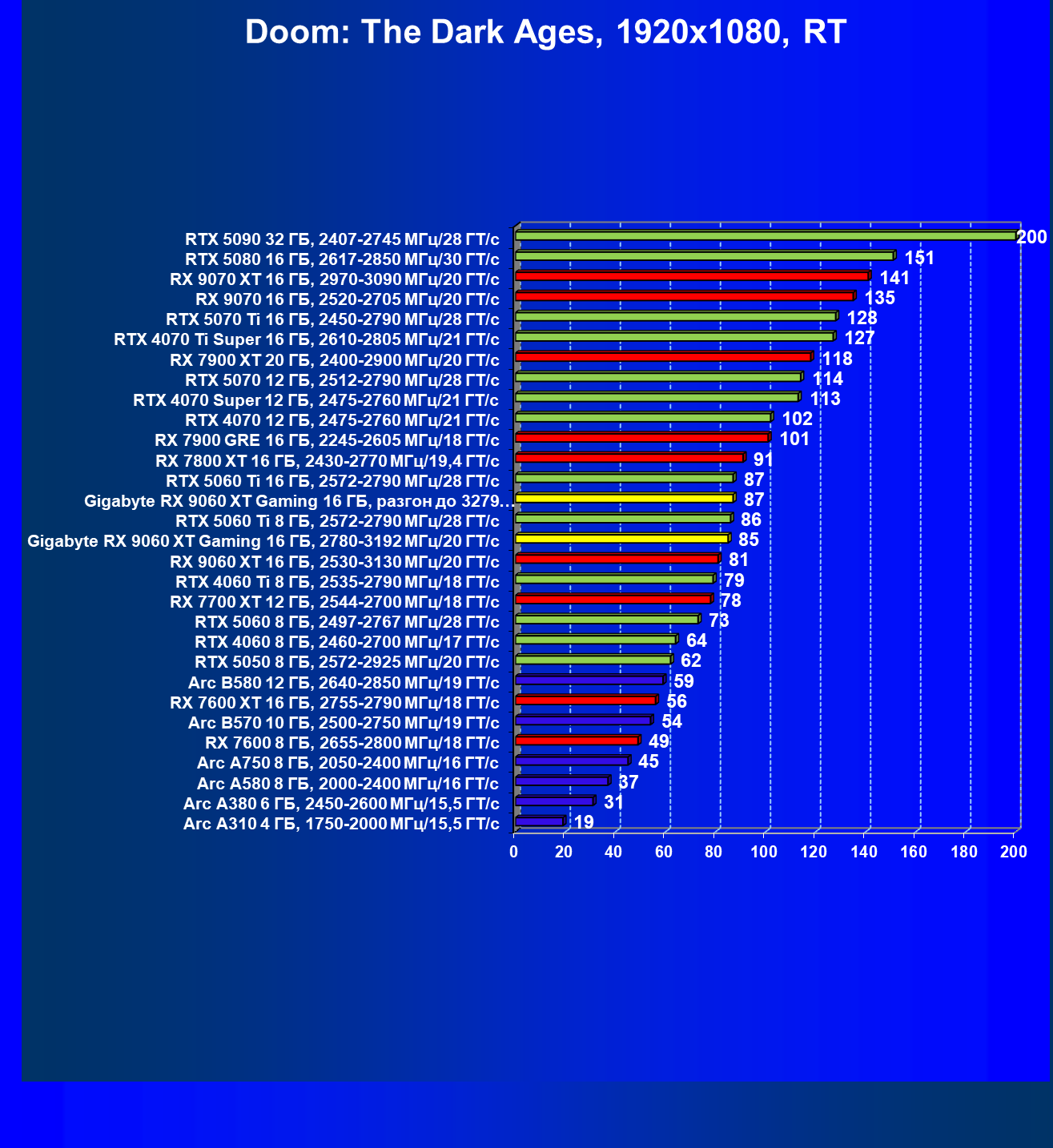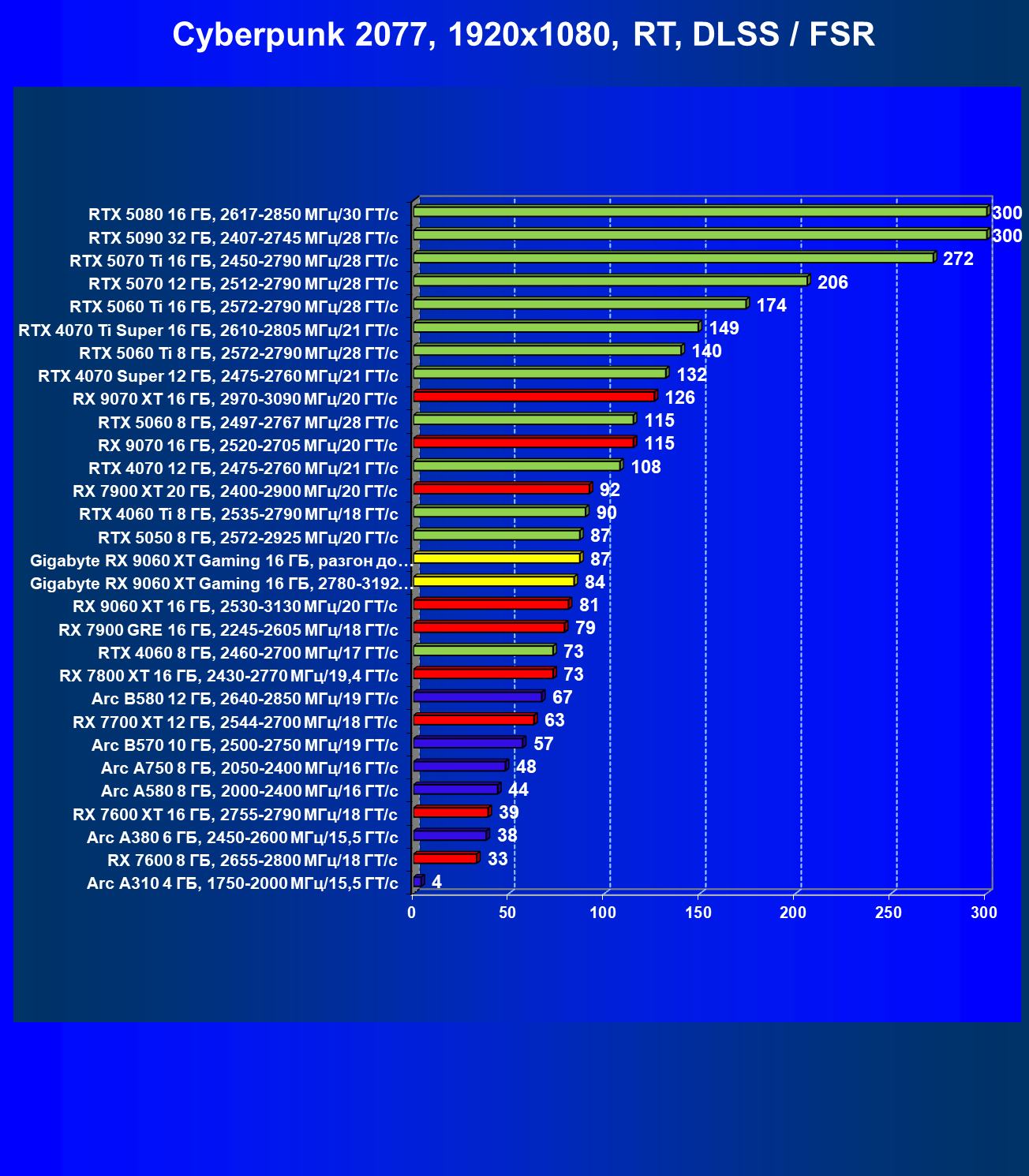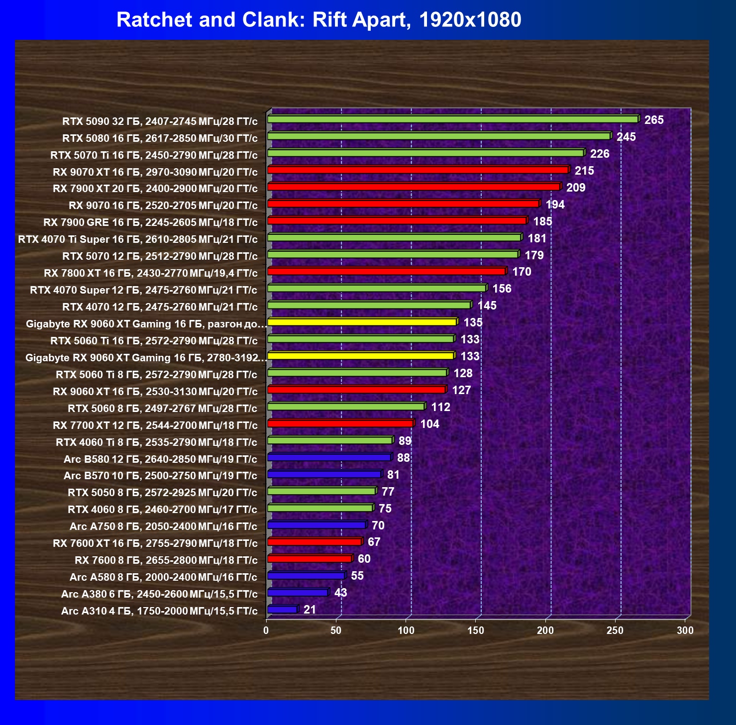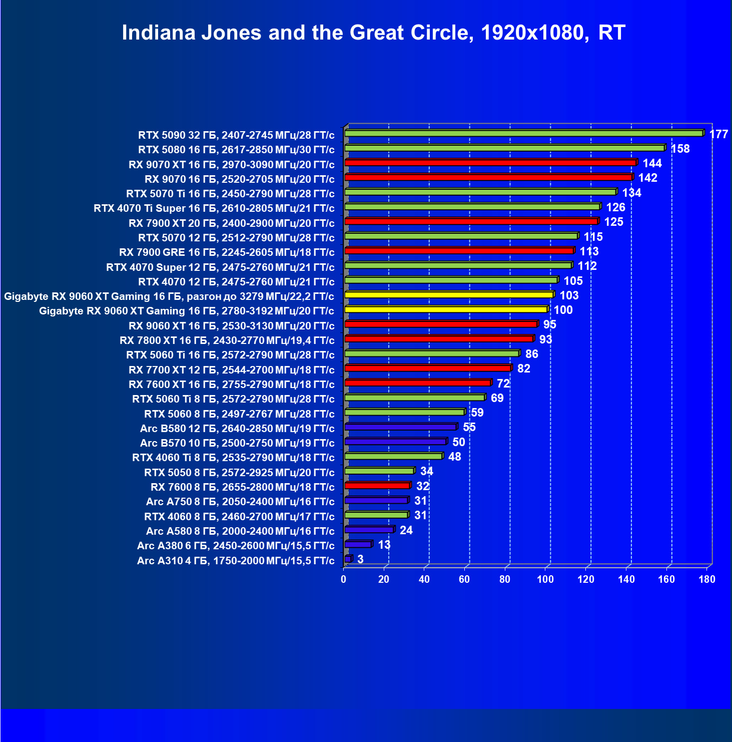 | 09 | Gigabyte RX 9060 XT Gaming 16 ГБ, 2780—3192 МГц/20 ГТ/с | 303 | 1363 | 45 000 |