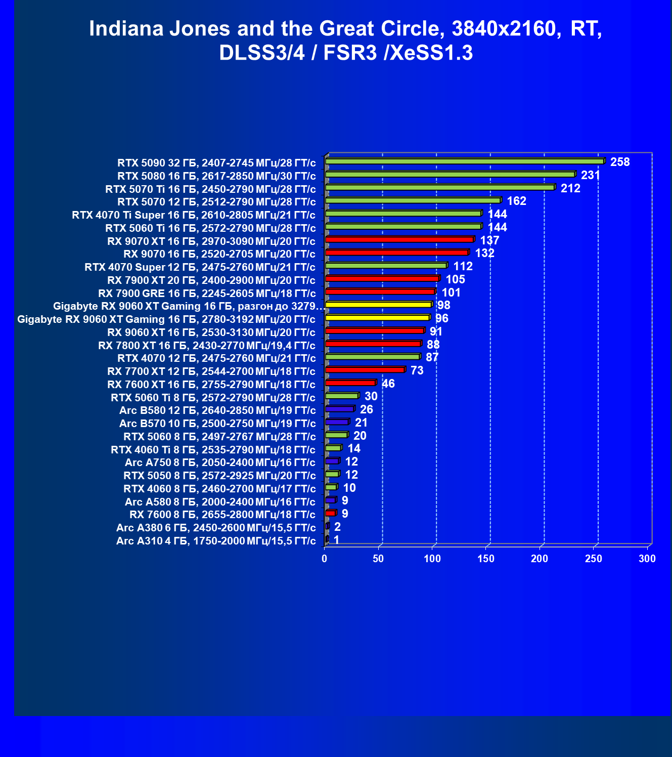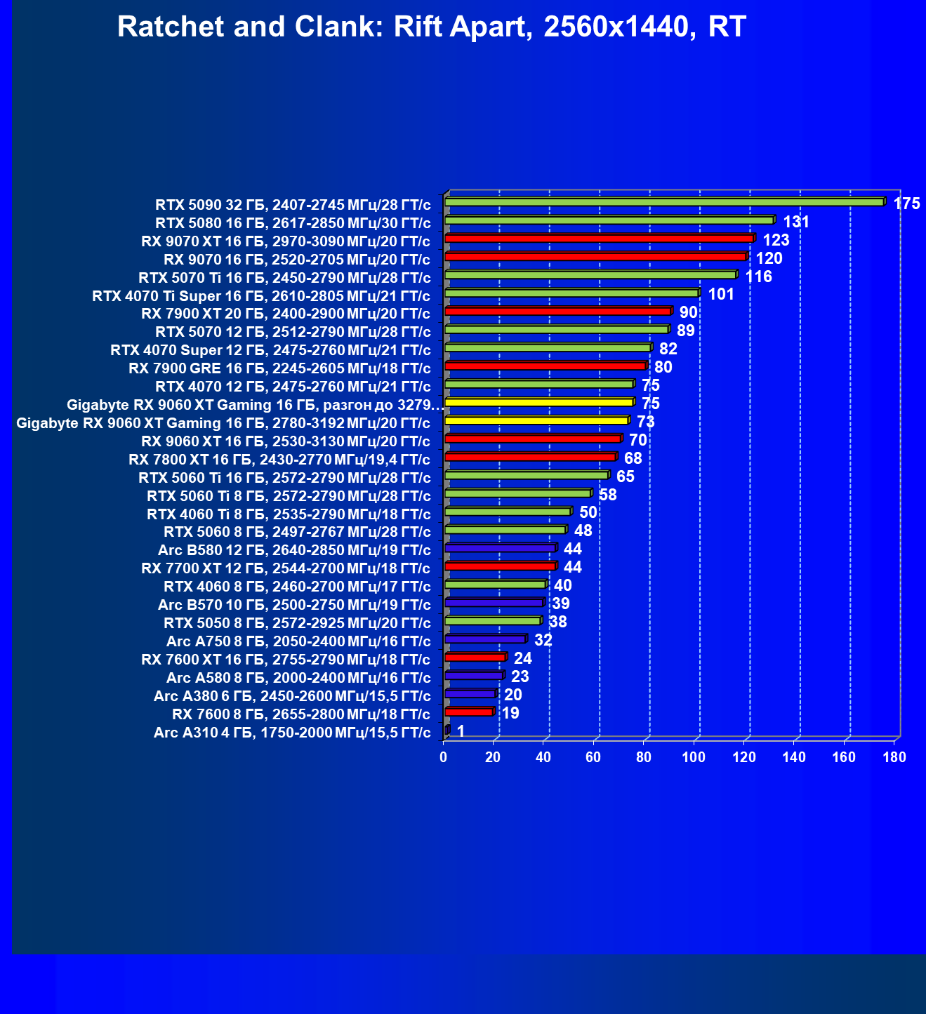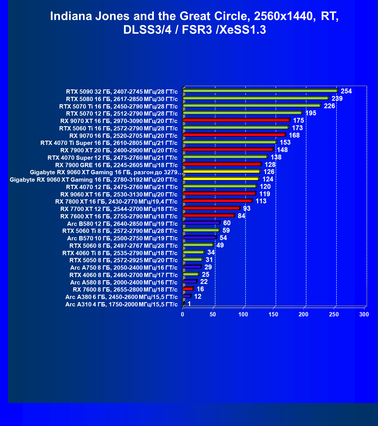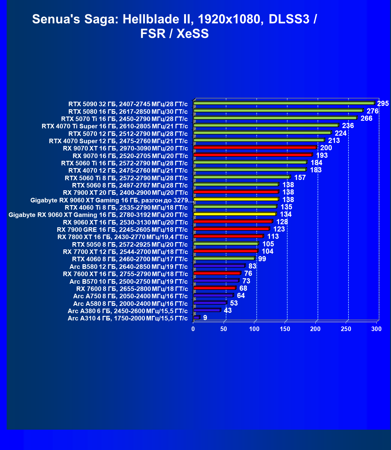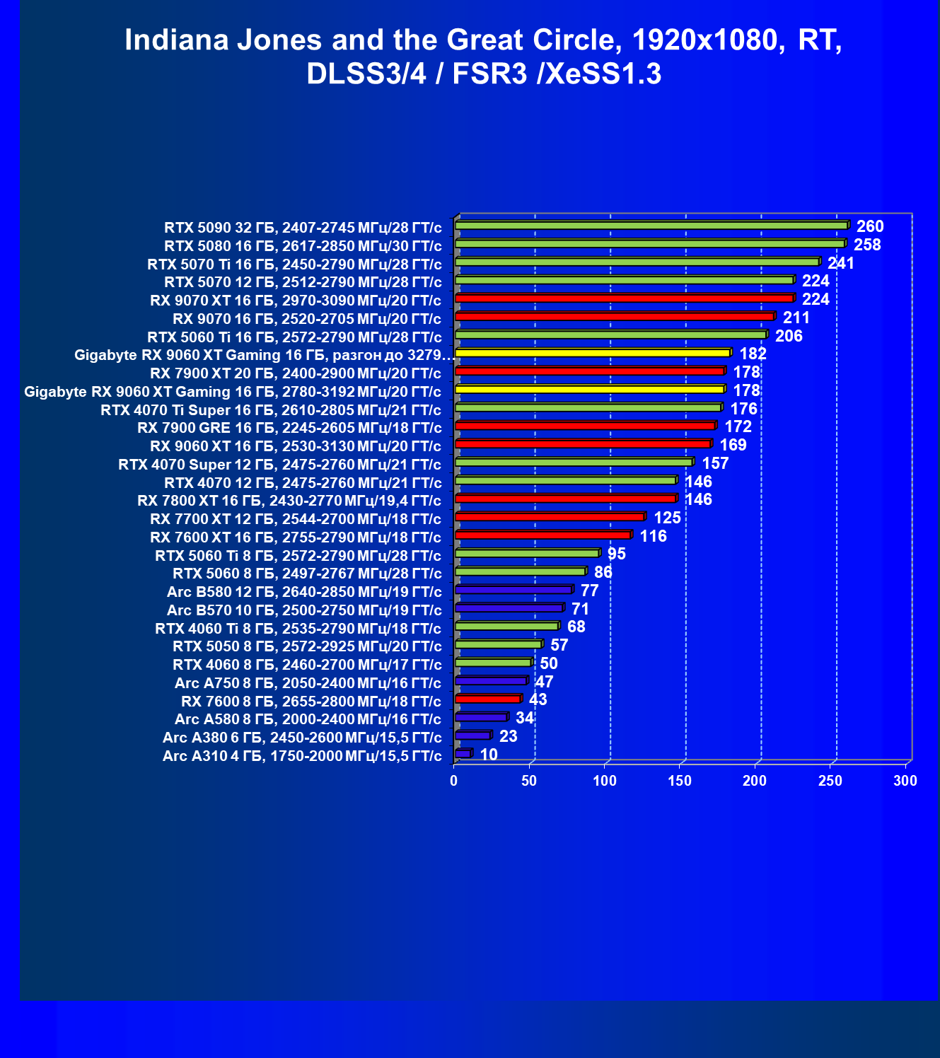 | 09 | Gigabyte RX 9060 XT Gaming 16 ГБ, 2780—3192 МГц/20 ГТ/с | 303 | 1363 | 45 000 |