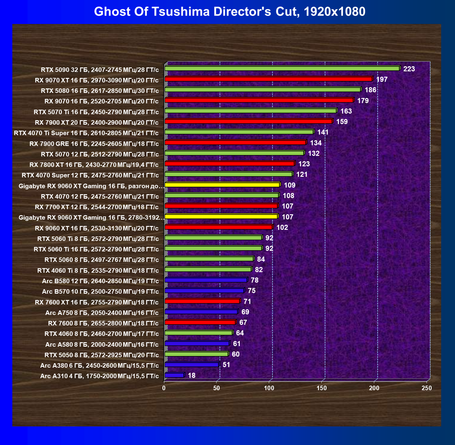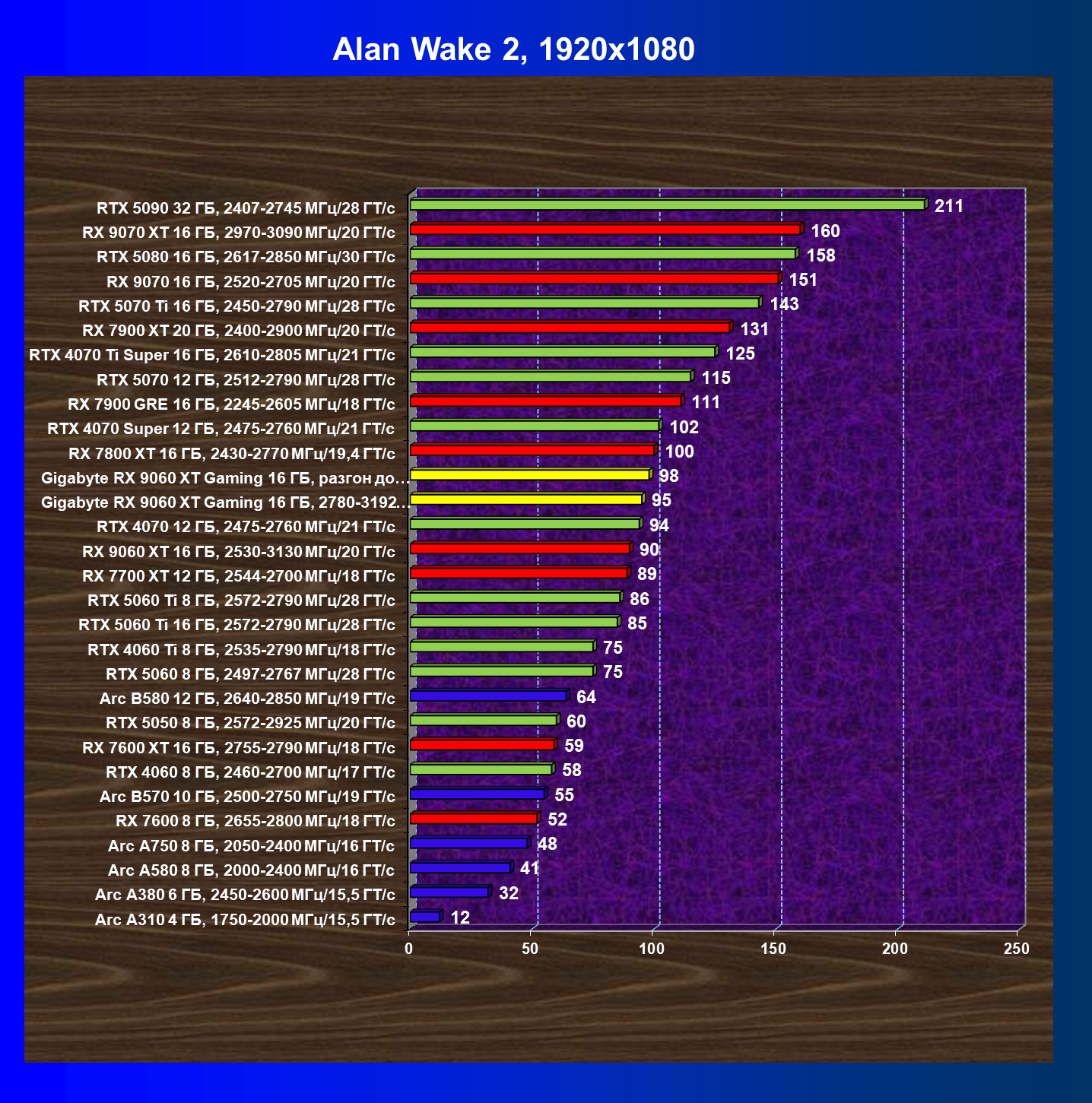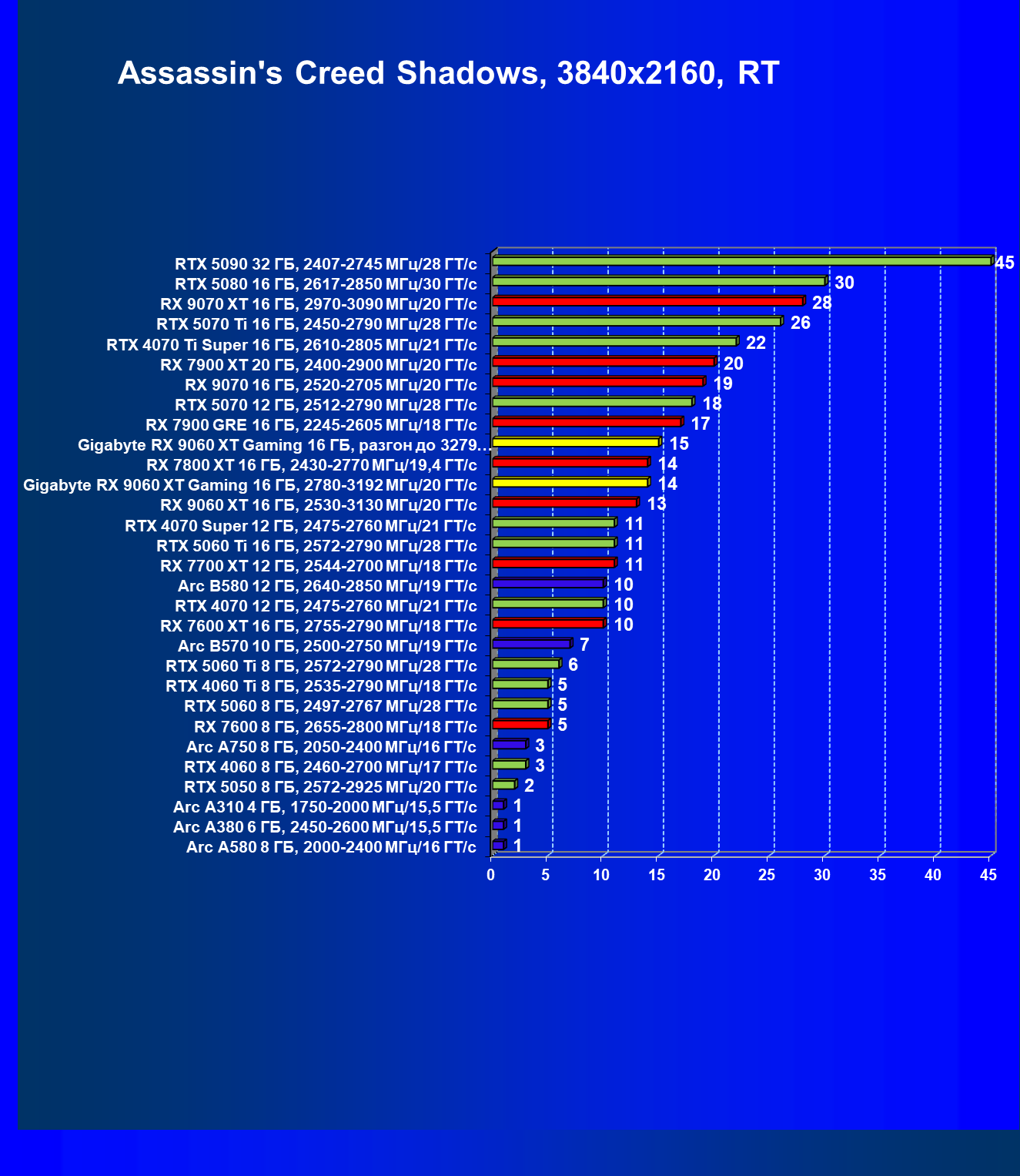 | 15 | RX 9060 XT 16 ГБ, 2530—3130 МГц/20 ГТ/с | 1302 | 289 | 45 000 |
