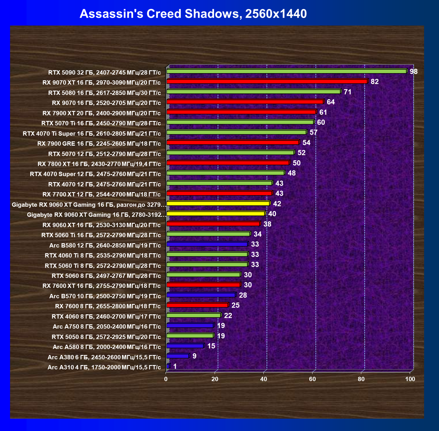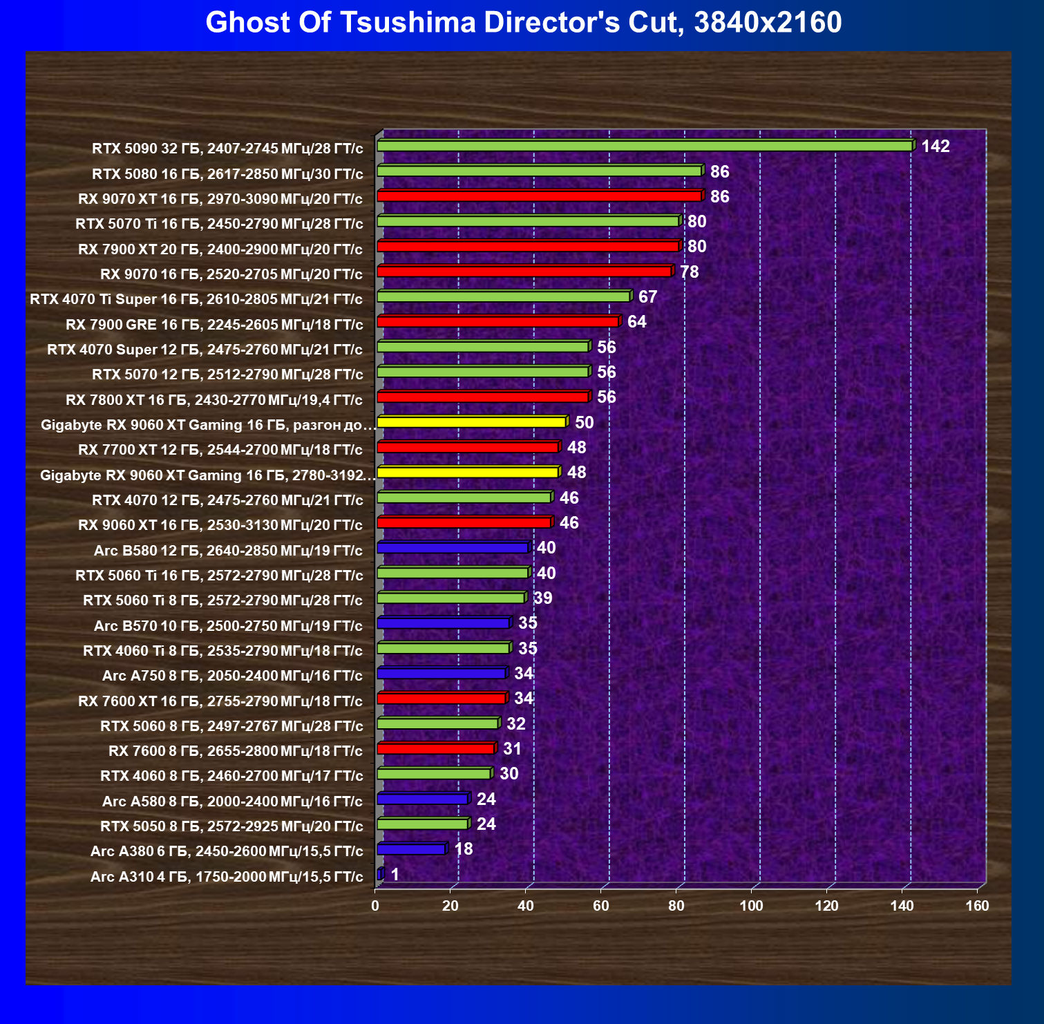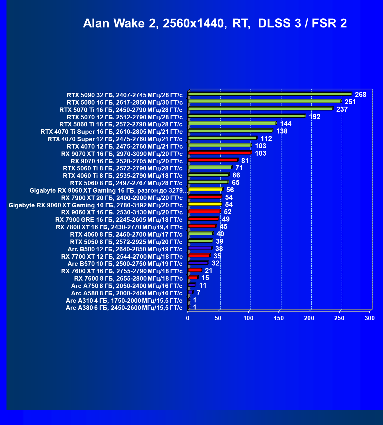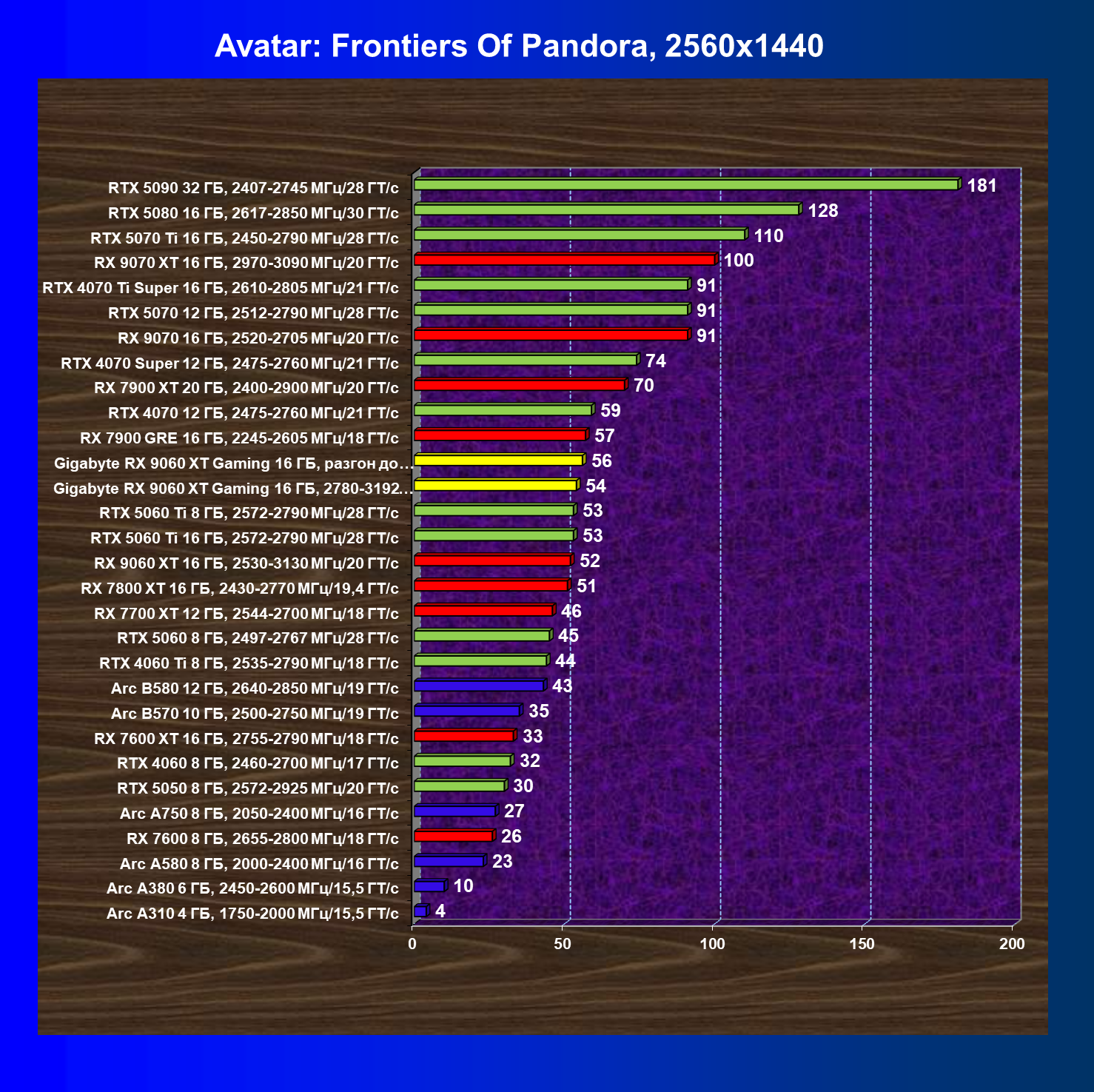 | 15 | RX 9060 XT 16 ГБ, 2530—3130 МГц/20 ГТ/с | 1302 | 289 | 45 000 |