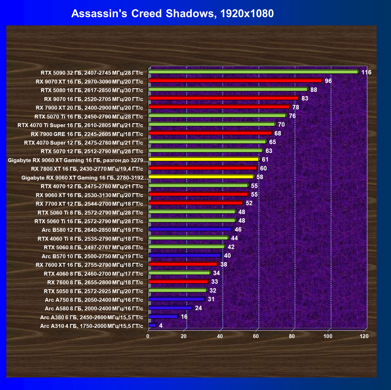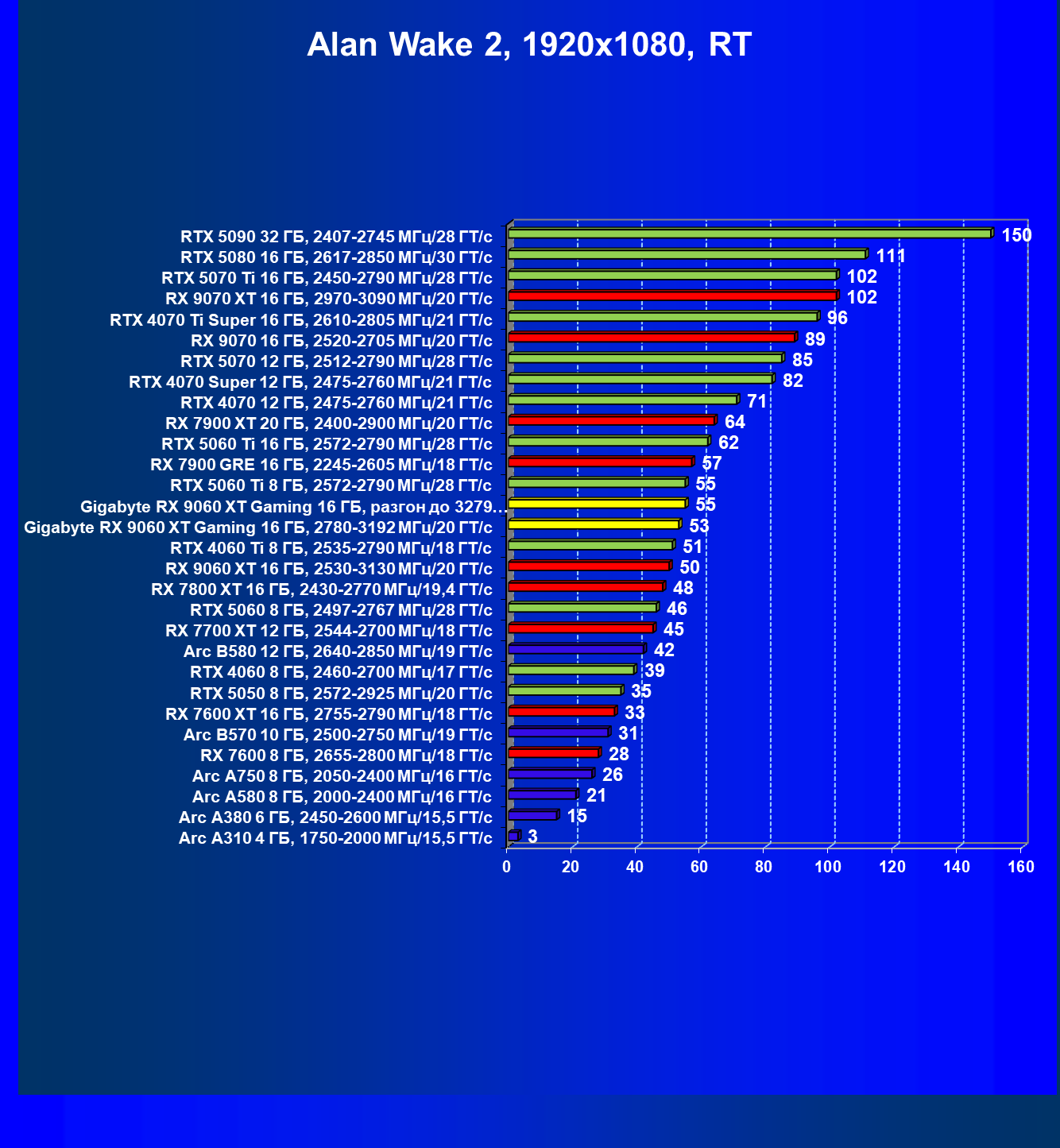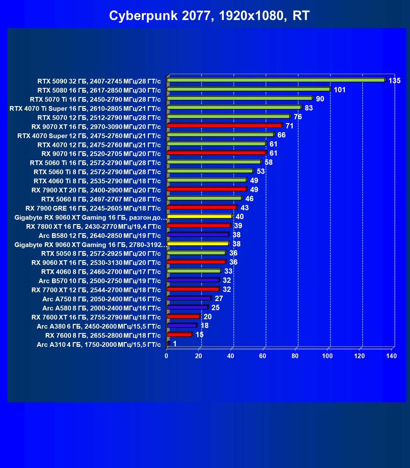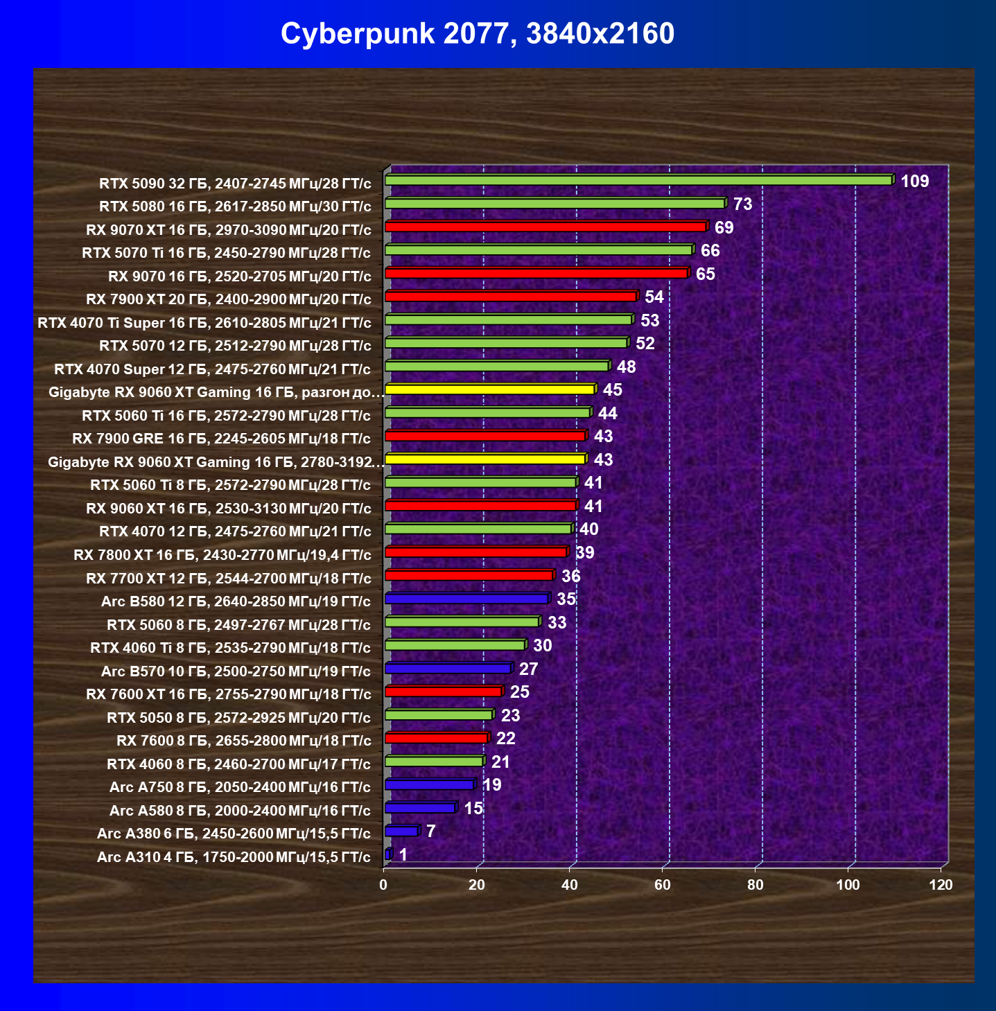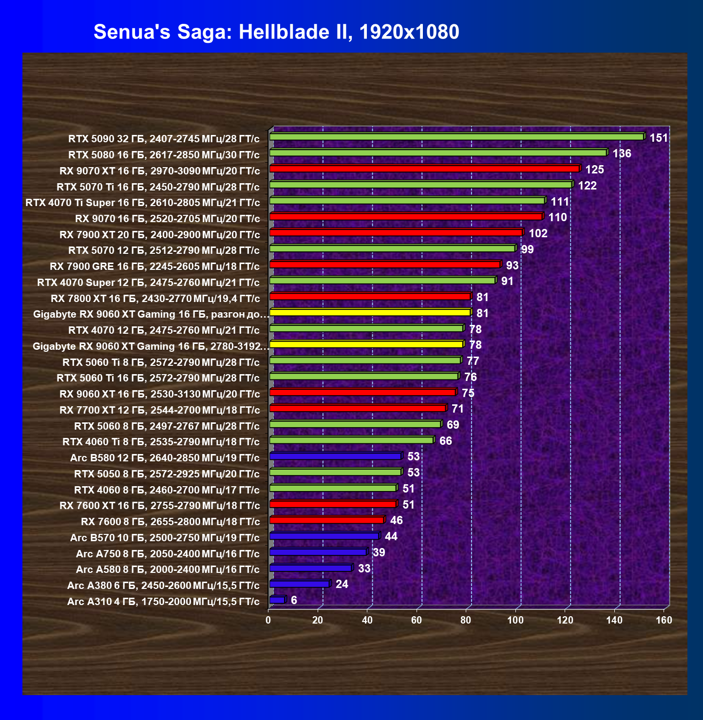 | 16 | RX 9060 XT 16 ГБ, 2530—3130 МГц/20 ГТ/с | 2423 | 539 | 45 000 |