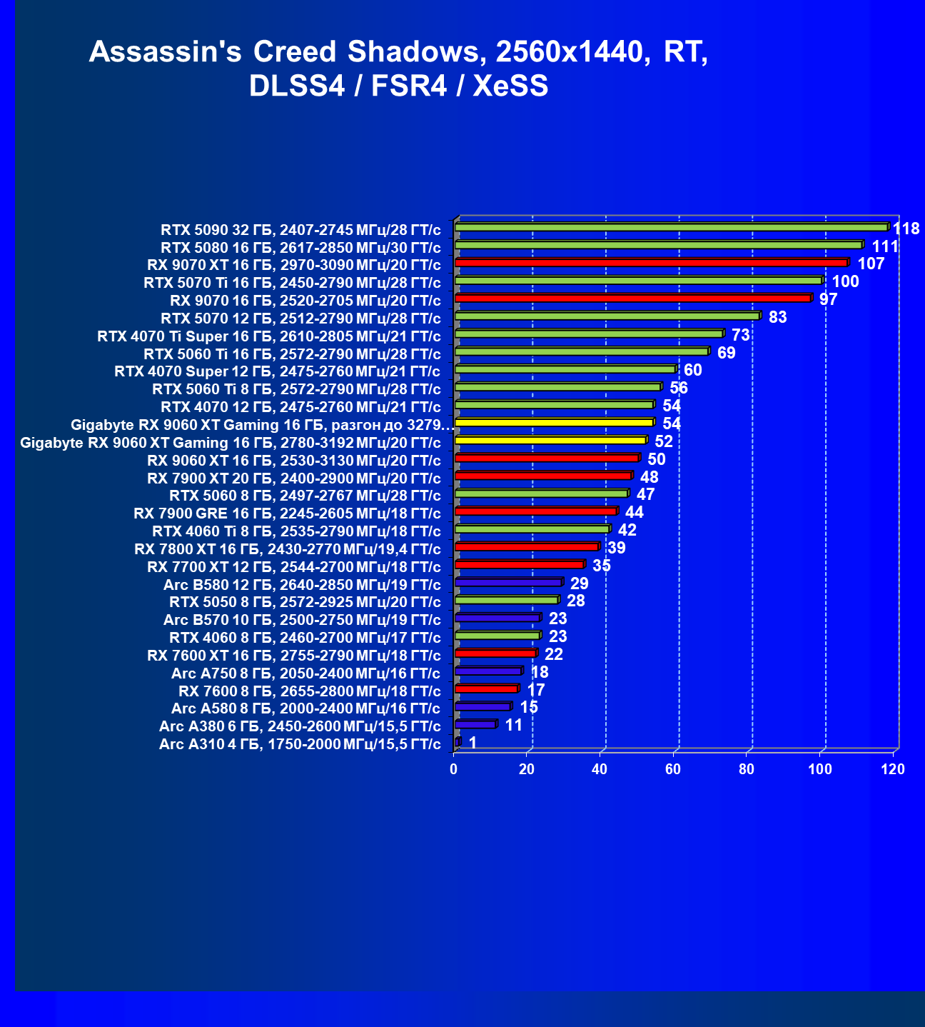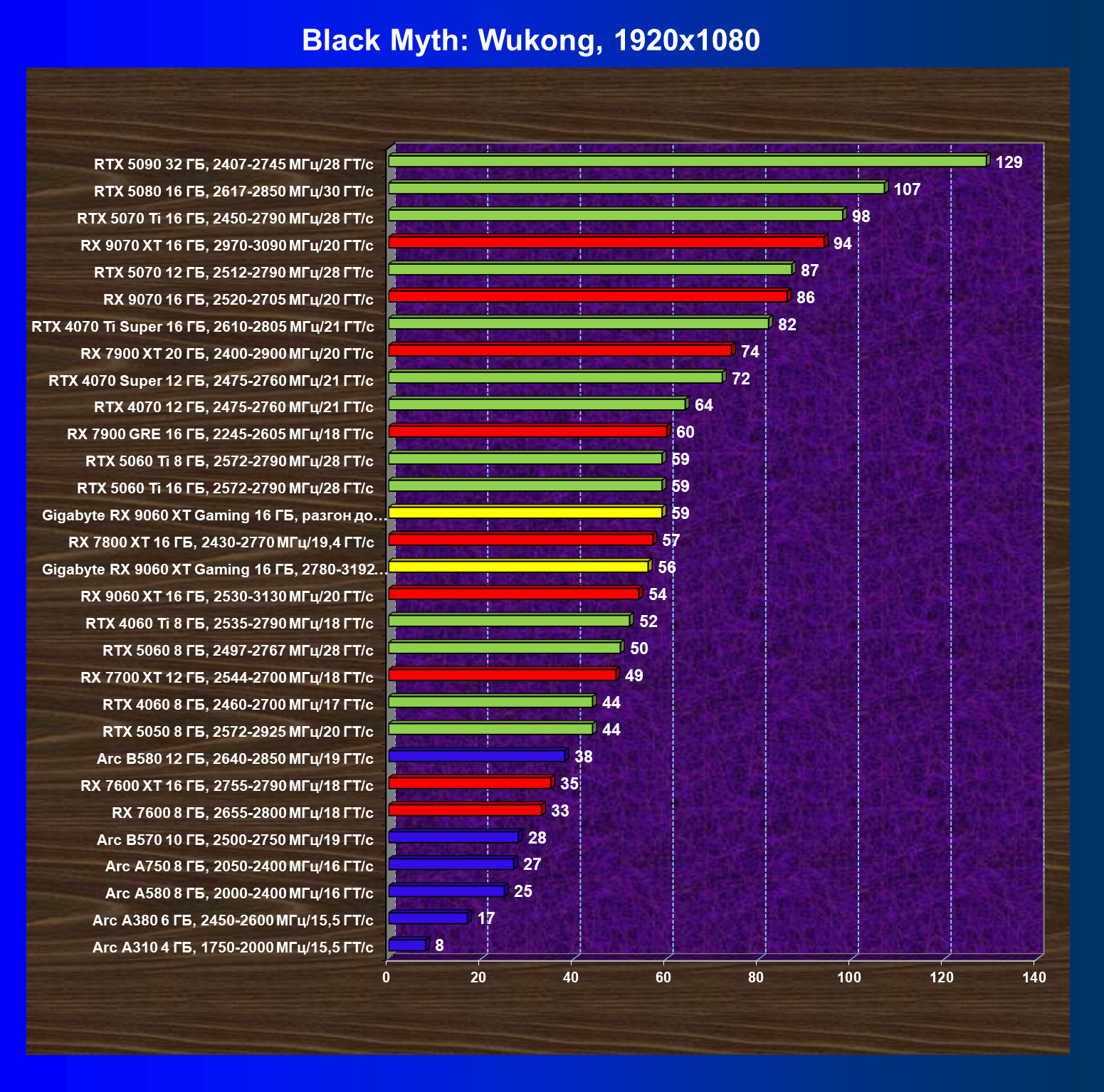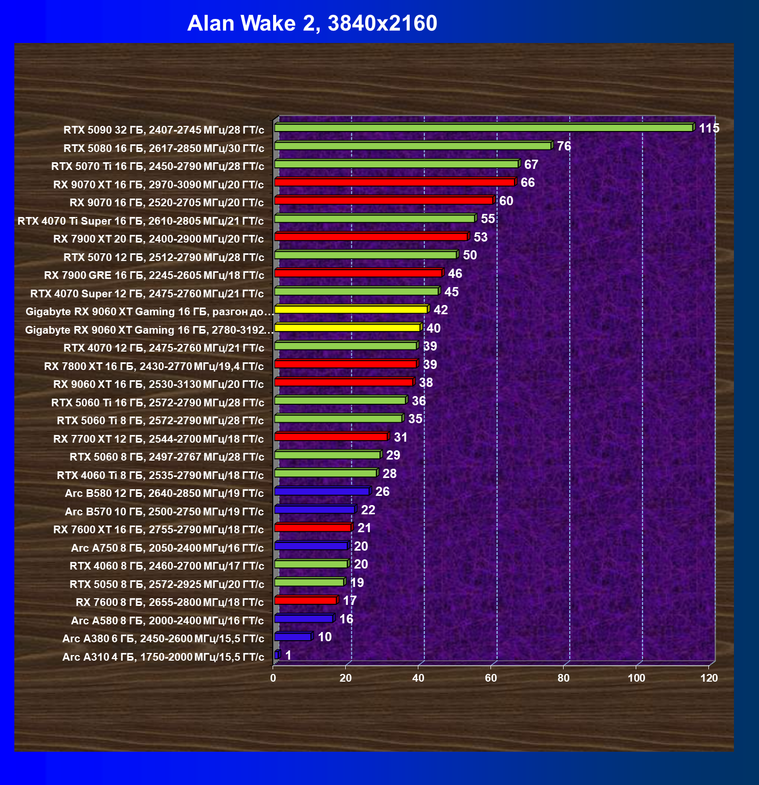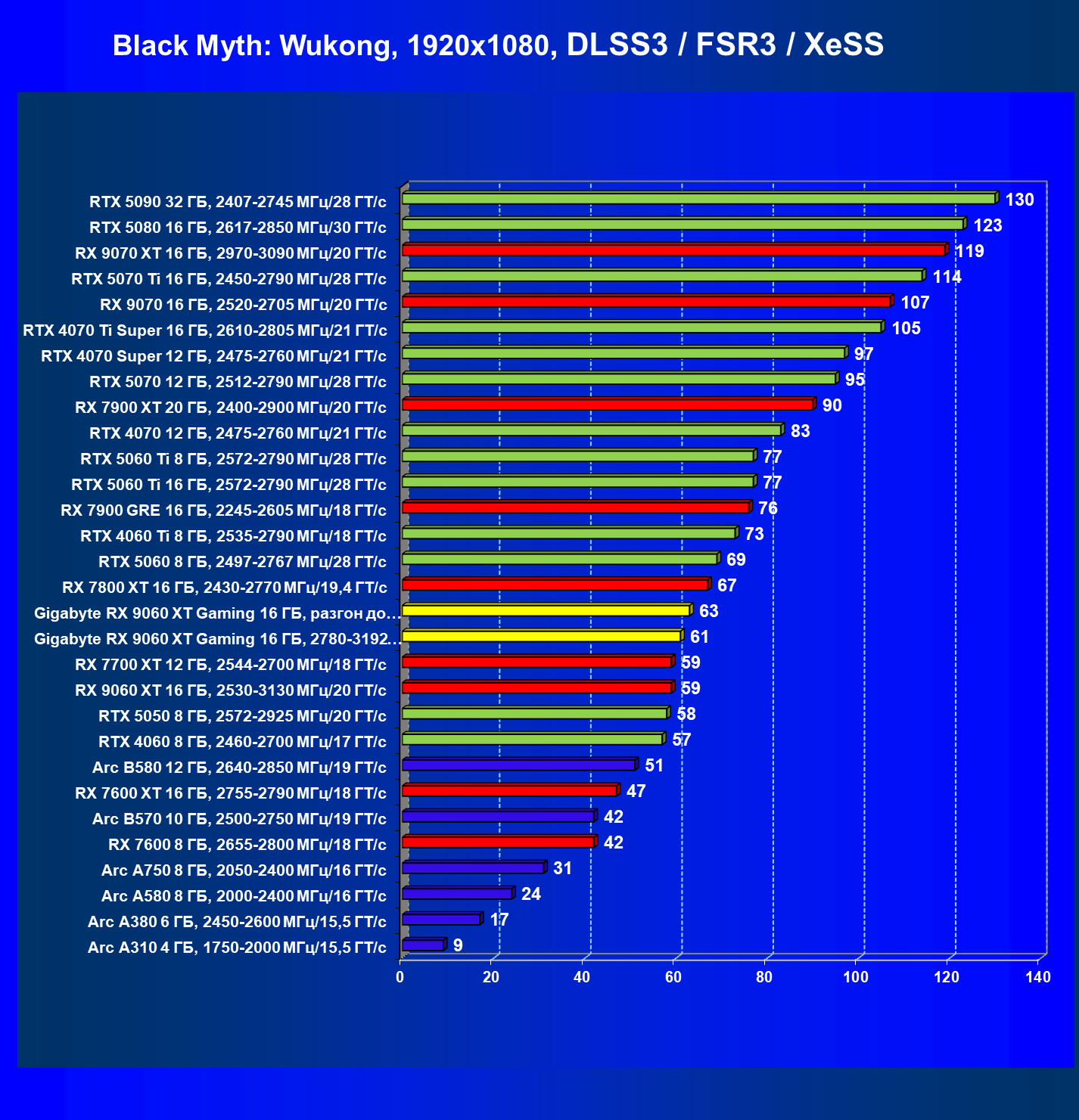 | 16 | RX 9060 XT 16 ГБ, 2530—3130 МГц/20 ГТ/с | 2423 | 539 | 45 000 |