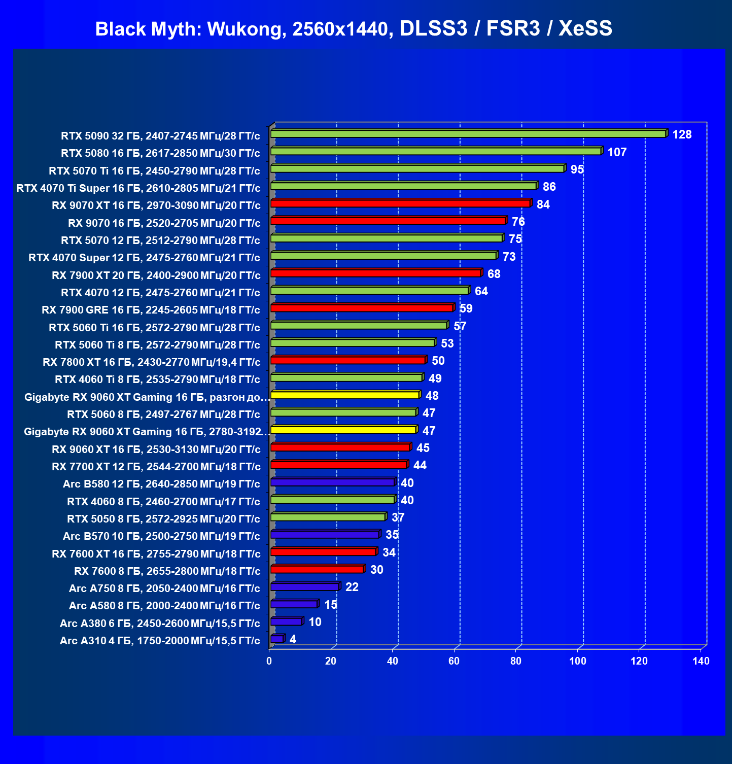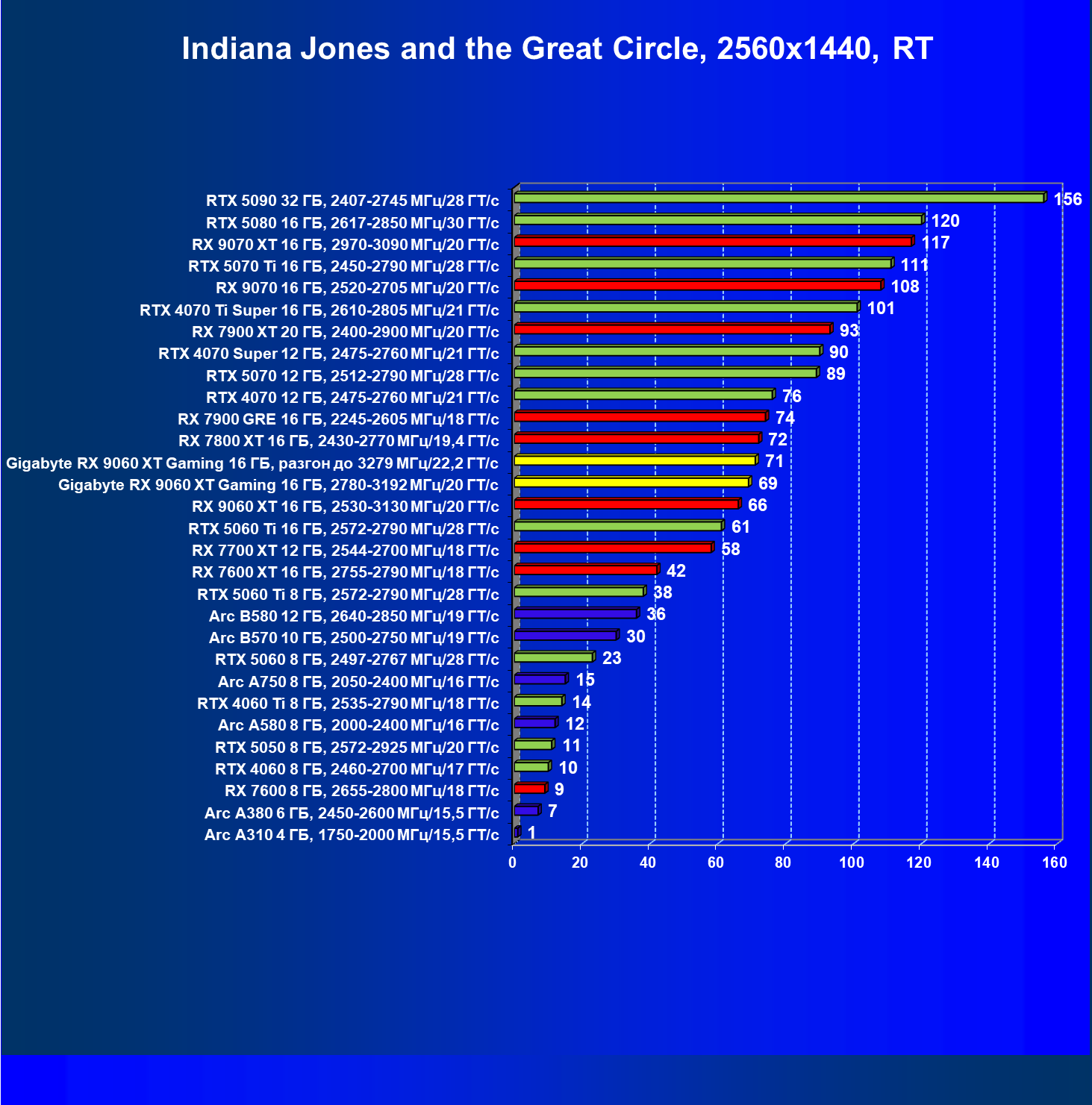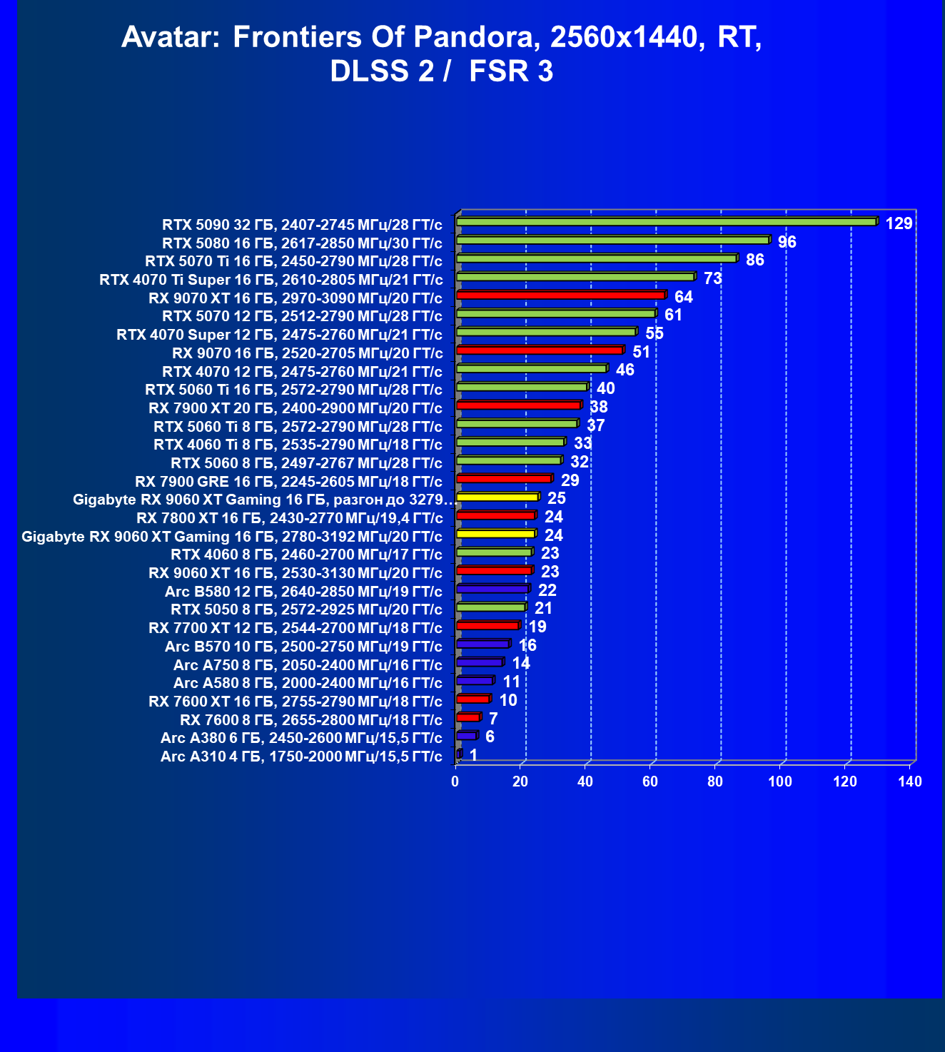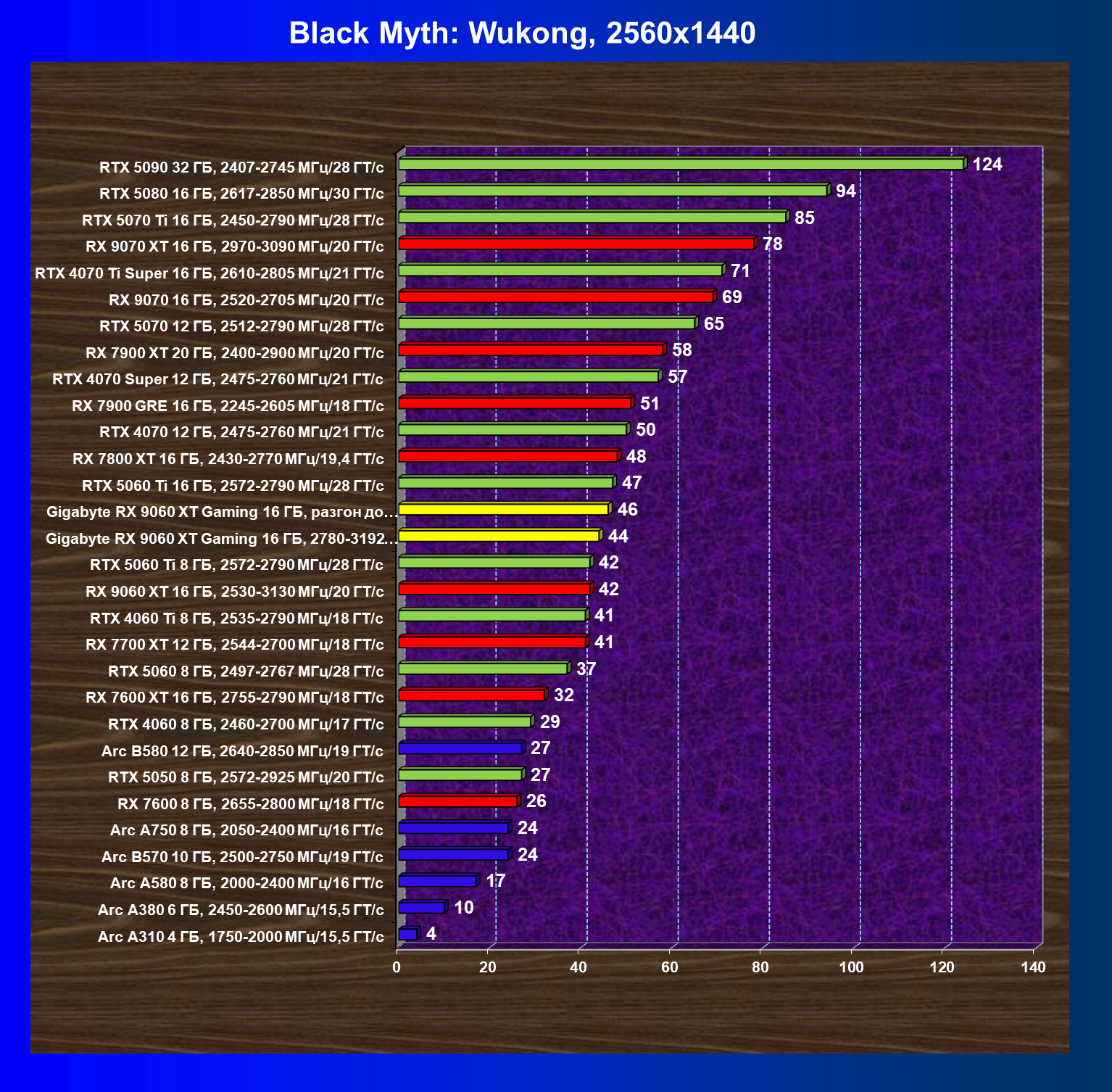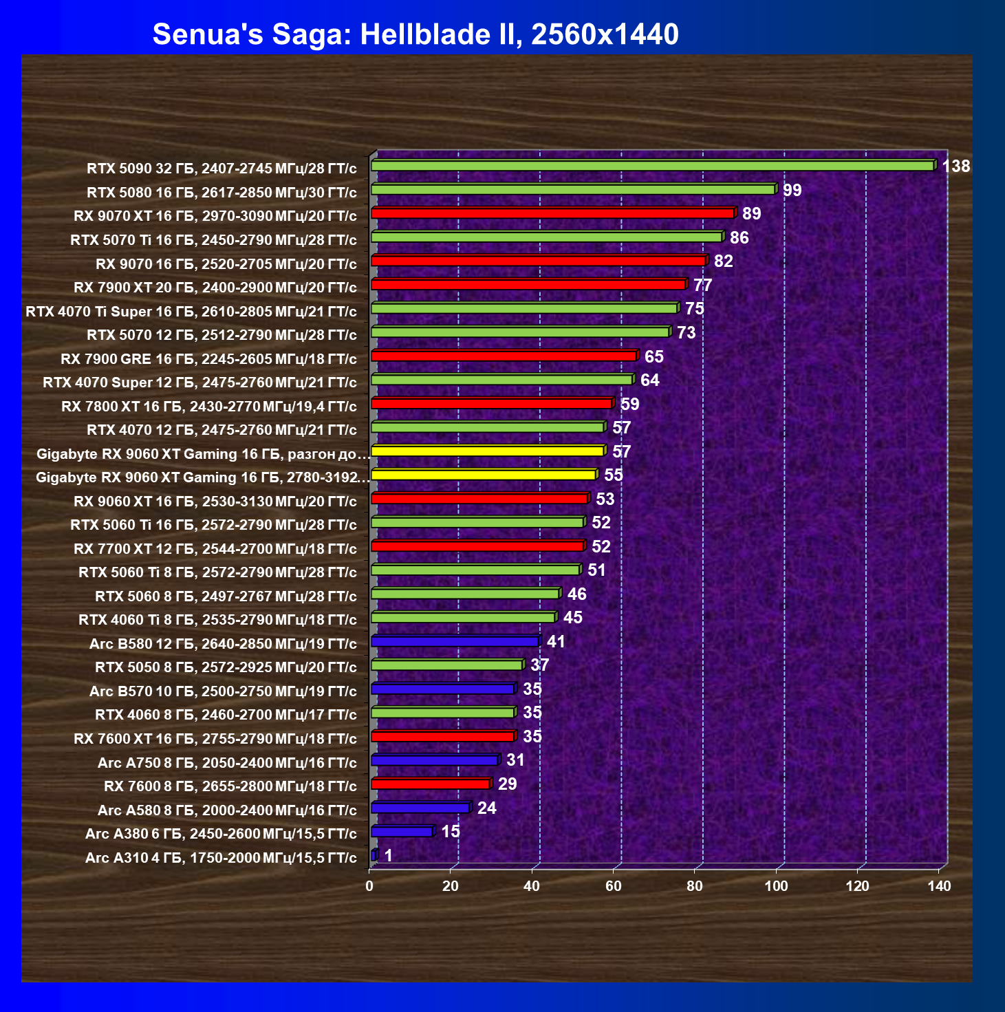 | 16 | RX 9060 XT 16 ГБ, 2530—3130 МГц/20 ГТ/с | 2423 | 539 | 45 000 |