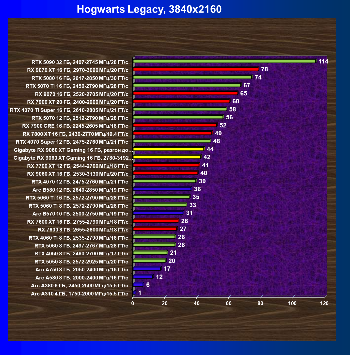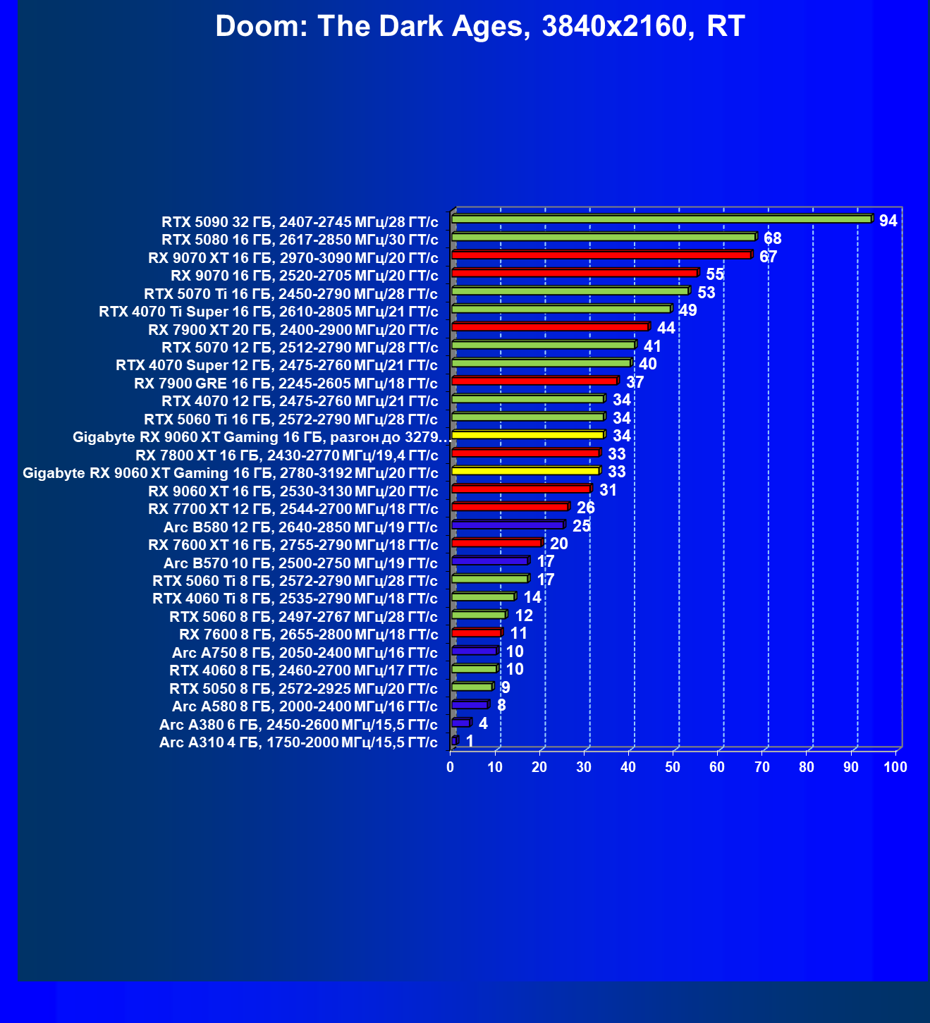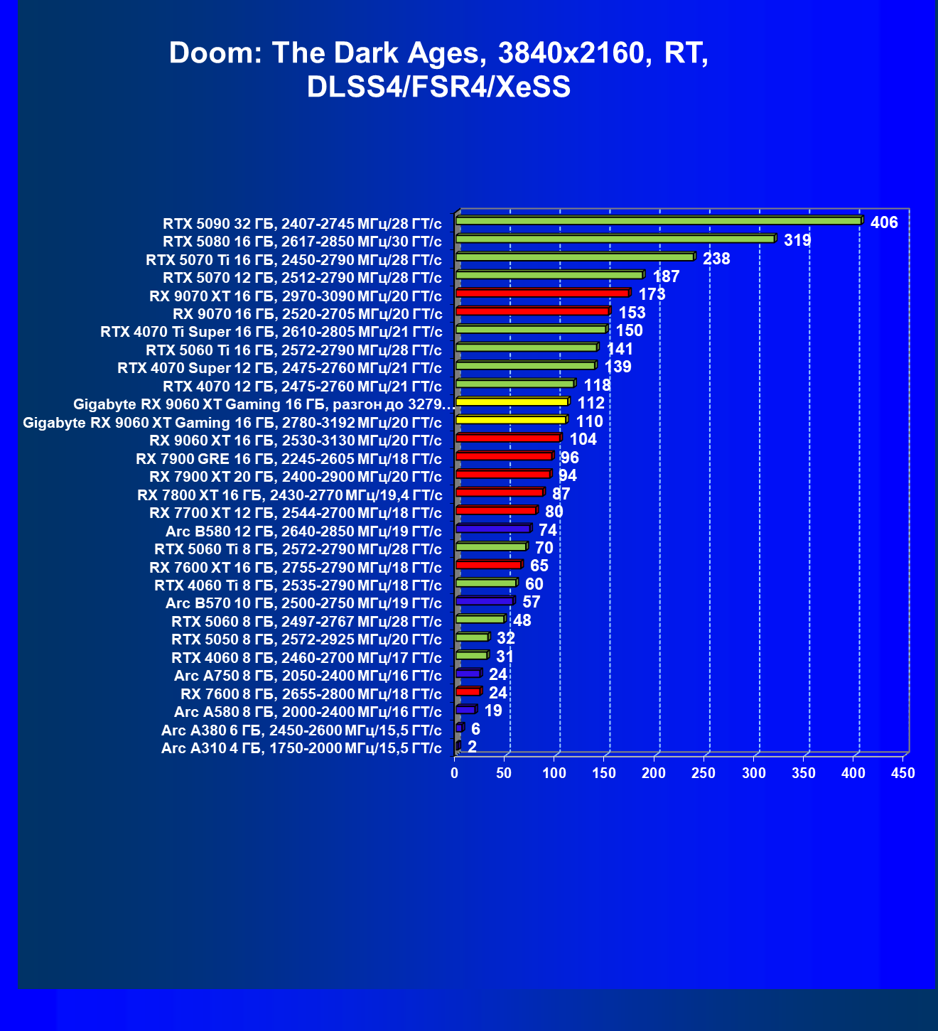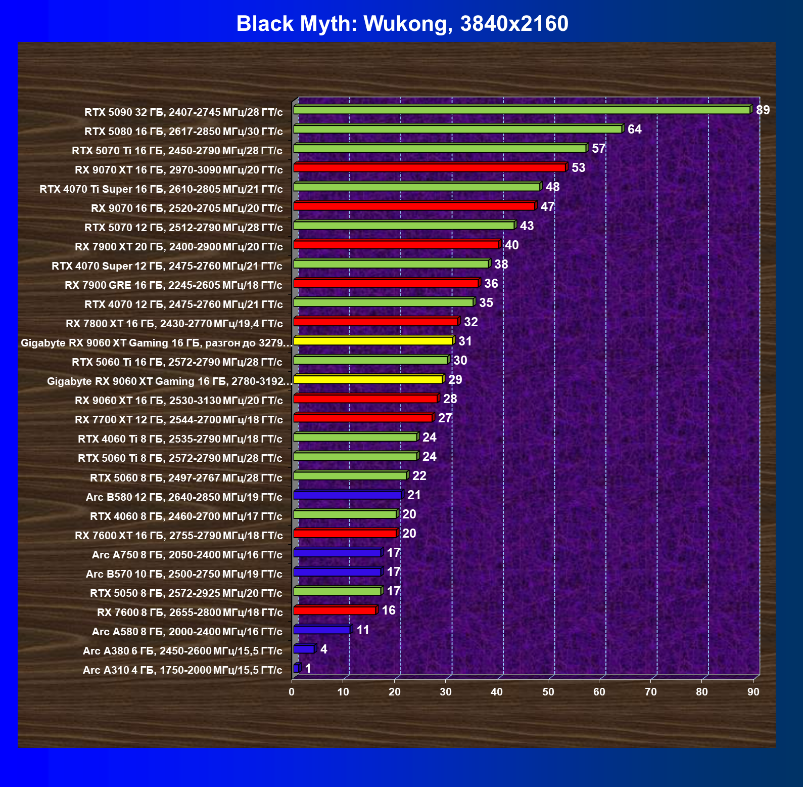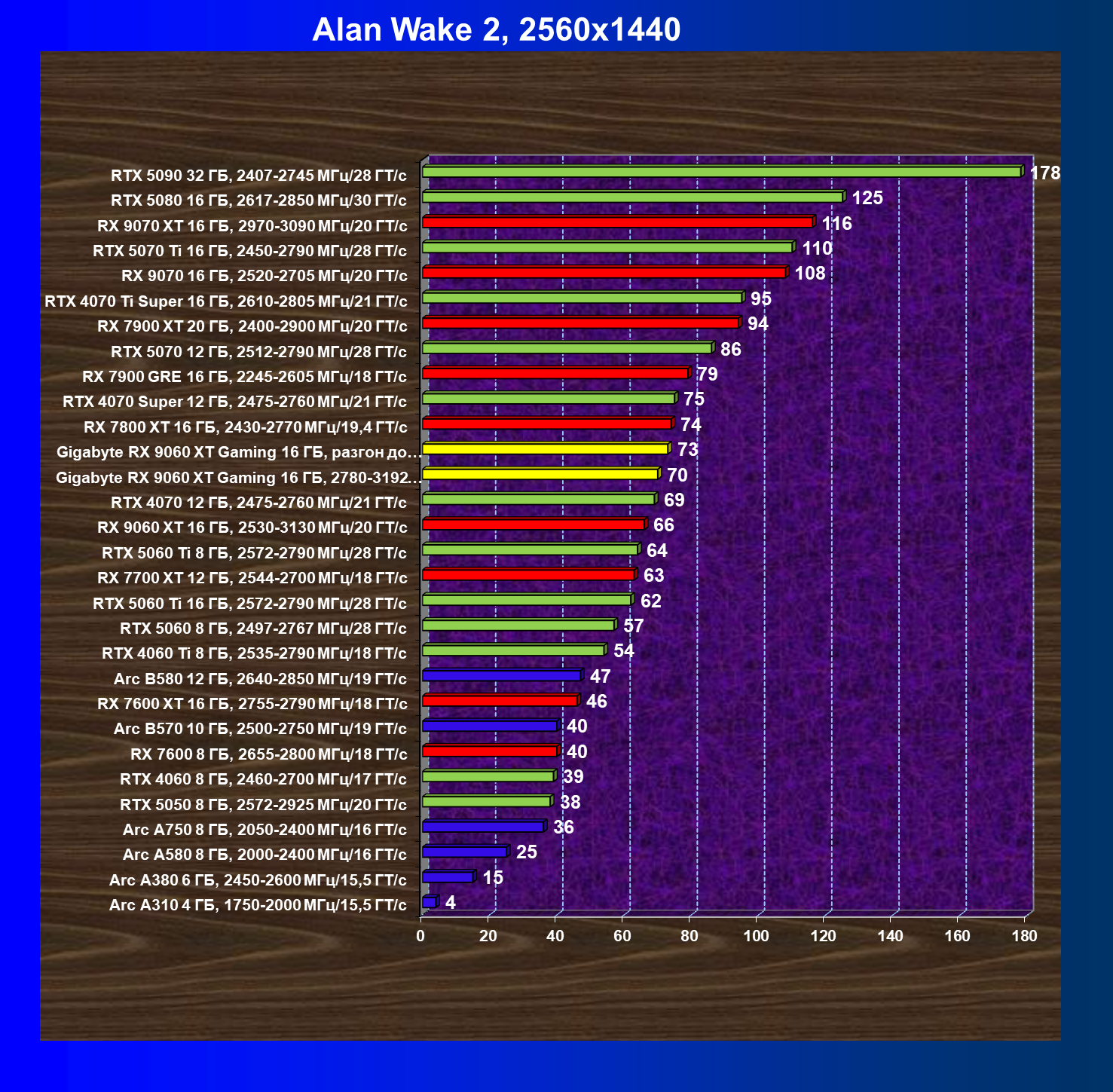| 16 | RX 9060 XT 16 ГБ, 2530—3130 МГц/20 ГТ/с | 2423 | 539 | 45 000 |
