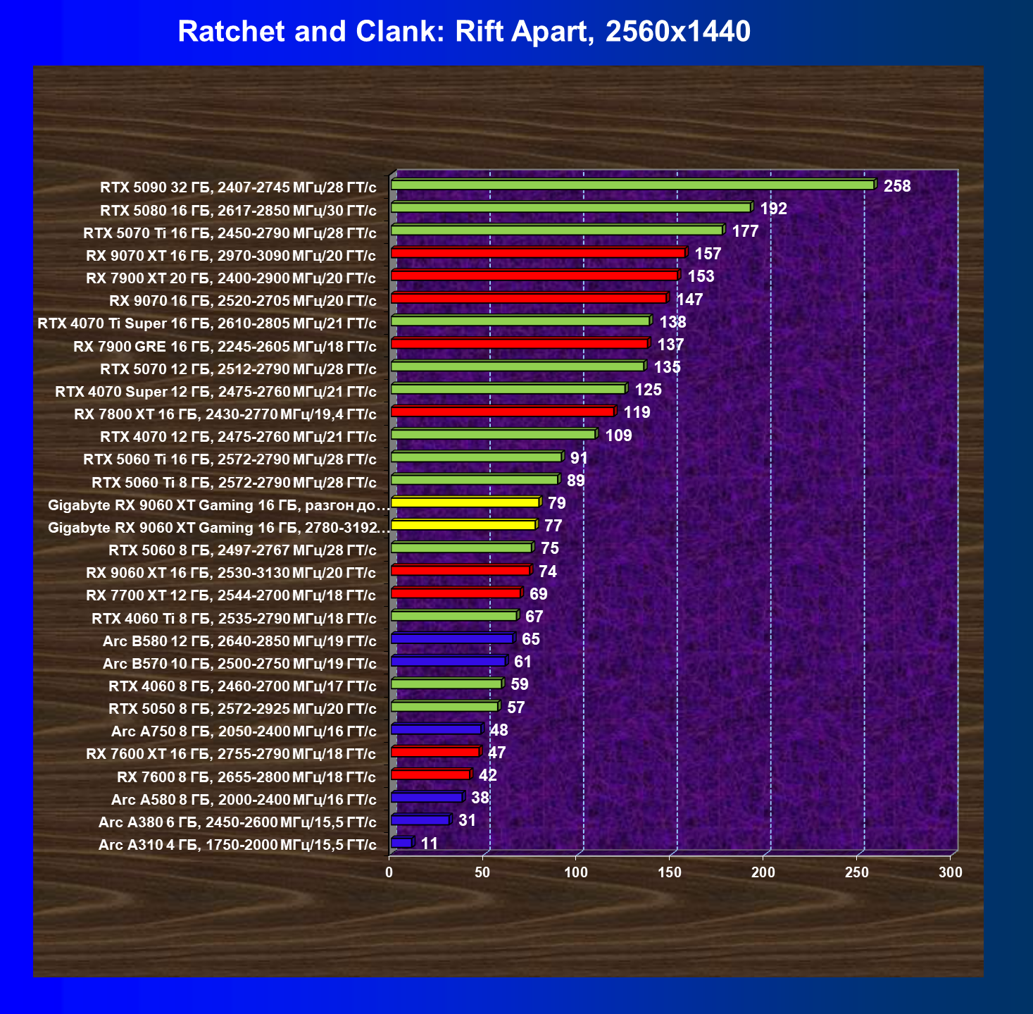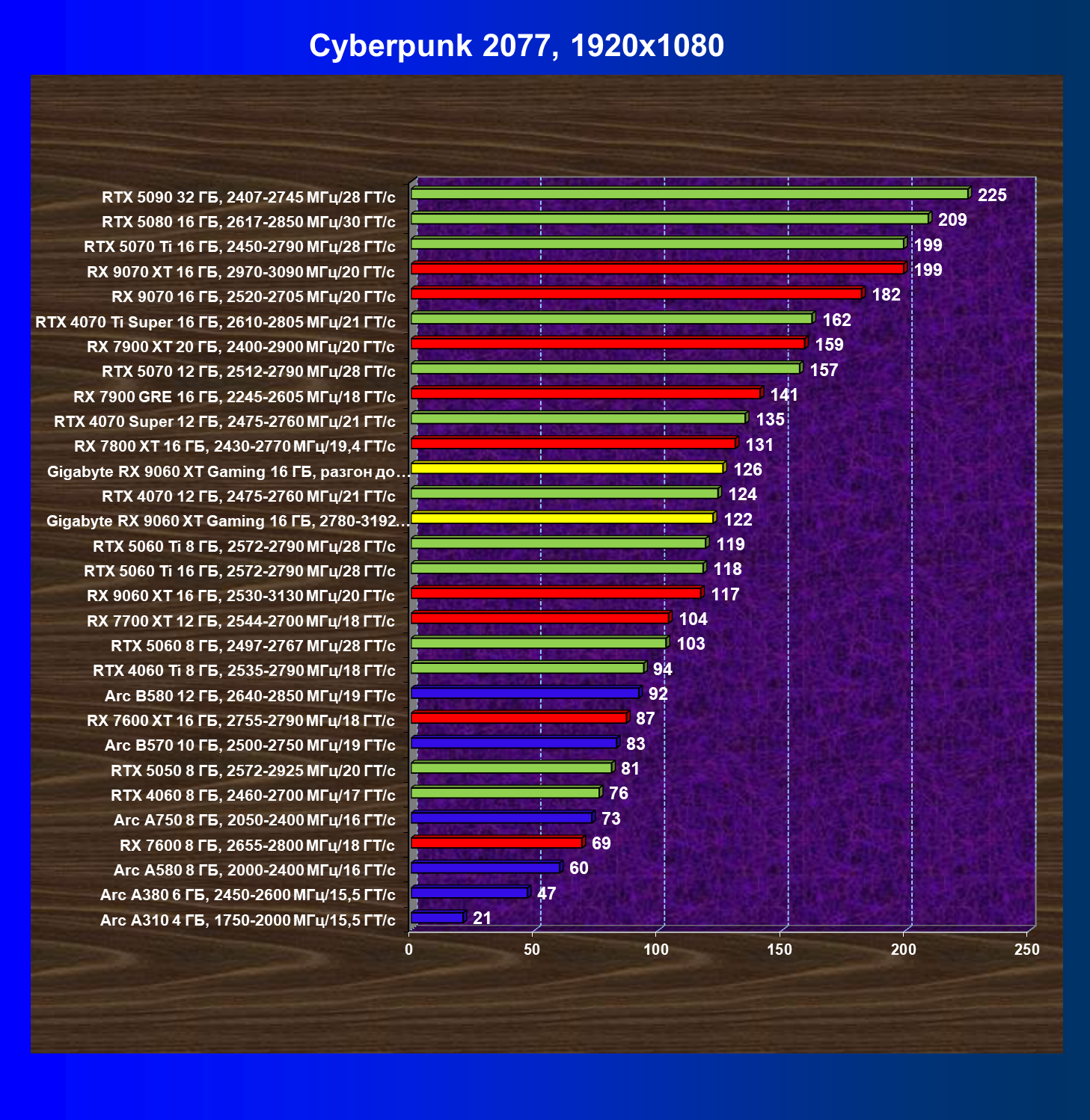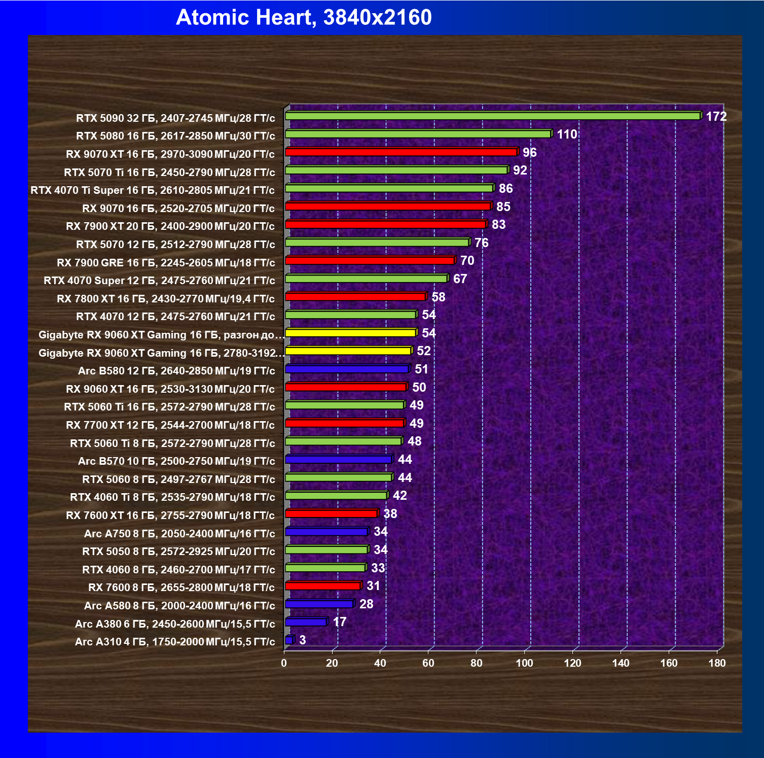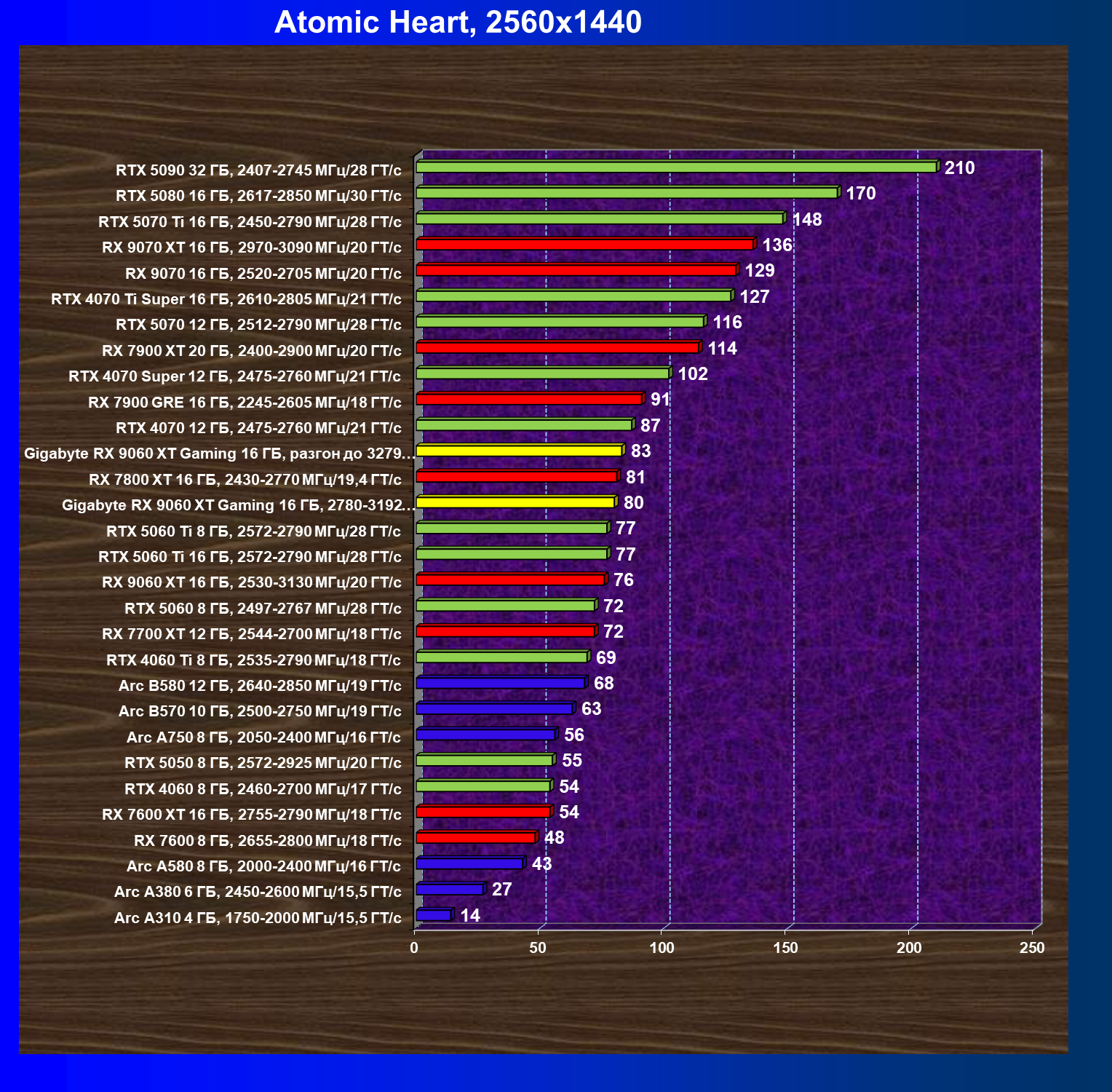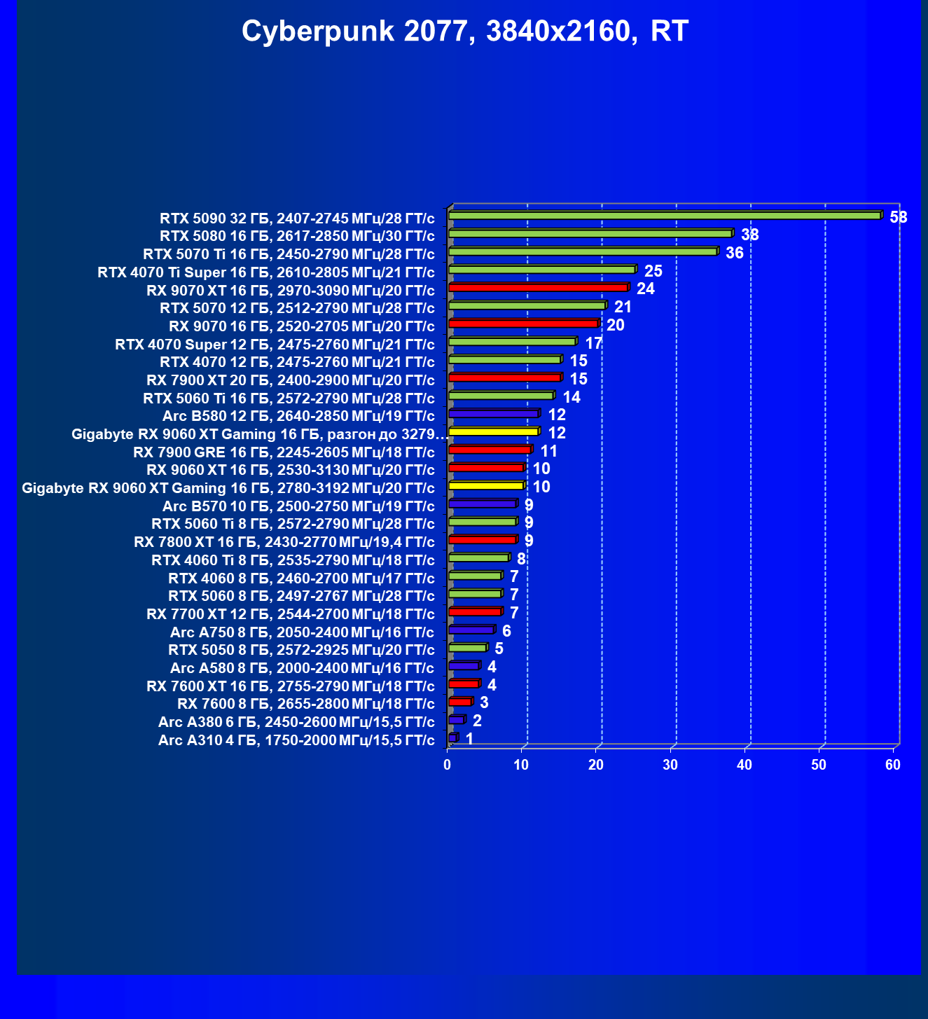 | 07 | Gigabyte RX 9060 XT Gaming 16 ГБ, разгон до 3279 МГц/22,2 ГТ/с | 581 | 2616 | 45 000 |